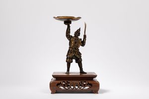 h cm 32,5 Giappone, periodo Meiji (1868-1912) Stile Miyao raffigurante un samurai che sostiene un piatto di forma [..]