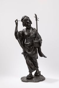 h cm 67 Giappone, periodo Meiji (1868-1912) Raffigurante una Geisha in cammino che regge uno shamisen con il [..]