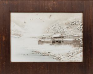h cm 36 x l cm 51,5 Giappone, periodo Meiji (1868-1912) Ben dipinta con un paesaggio, reca iscrizioni sul fronte [..]