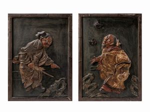 h cm 70,5 x l cm 51 Giappone, fine XIX secolo Sono finemente intarsiasti e raffigurano due figure orientali con [..]