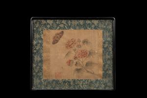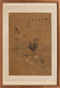 h cm 34 x l cm 23,5 Cina, dinastia Qing (1644-1911) Ben dipinto con farfalle tra fiori in un giardino, in alto [..]