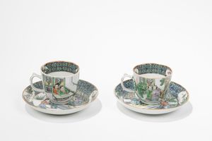 h tazzina cm 6,5 x d piattino cm 13,5 Cina, dinastia Qing, fine XIX secolo Decorate in stile cantonese con smalti [..]