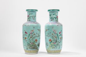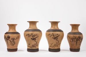 h cm 45 Cina, inizio XX secolo Decorati su fondo turchese sgraffito, sono ben dipinti con uccelli tra rocce, [..]