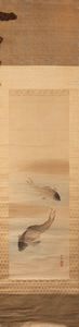 h max cm 186 x l max cm 46 Giappone, periodo Meiji (1868-1912) Ben dipinto con due carpe e iscrizioni.