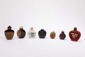 h max. cm 7,5 cm Cina, XIX / XX secolo Una in lacca di cinabro rossa con pietre dure, due in agata, una in ambra, [..]