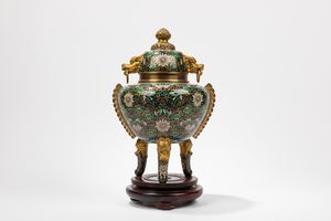 h cm 32,5 Cina, XX secolo Sorretto da una base tripode con teste di drago in bronzo, il corpo è smaltato con [..]