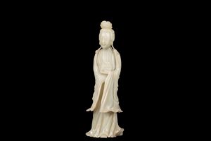 h cm 30 Cina, dinastia Qing, XIX secolo Raffigurata con in mano un rotolo, i capelli legati ordinatamente in [..]