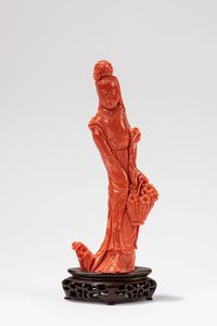 h tot. cm 40 Cina, inizio XX secolo Finemente intagliato su una base a trespolo con onde e vegetazione, con una dama dalla [..]