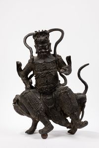 h cm 51 Cina, dinastia Ming (1368-1644) Raffigurante un personaggio in armatura seduto su di un leone.