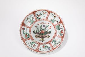 d cm 36 Cina, periodo Kangxi (1661-1722) Ben dipinto con smalti verdi, gialli, rossi, marroni, e blu, al centro [..]
