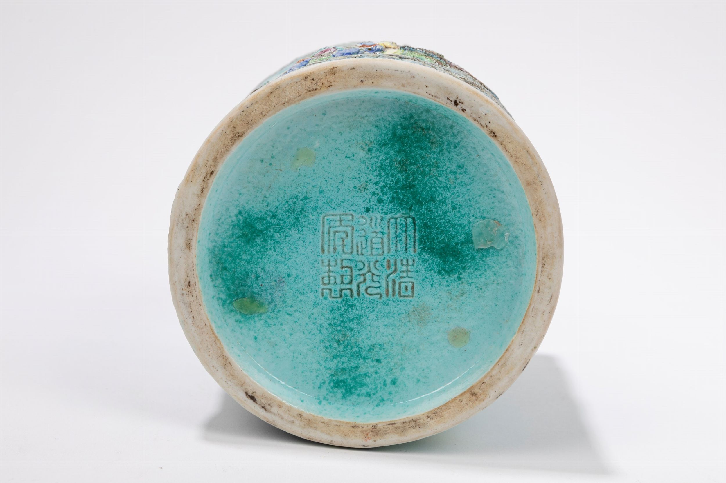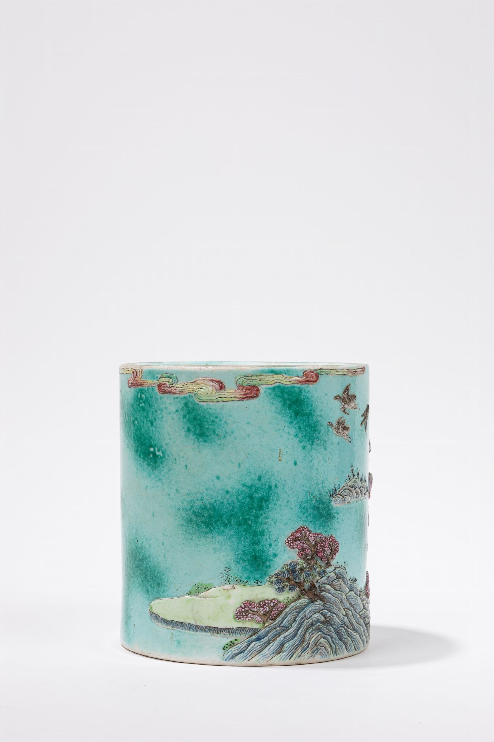 h cm 14 x d cm 12,5 Cina, inizio XX secolo Finemente modellato e dipinto su fondo turchese, è decorato a rilievo con una scena di cavalieri in un paesaggio tra montagne e alberi; al centro della base reca il marchio apocrifo sigillare inciso a sei caratteri dell'Imperatore Daoguang.