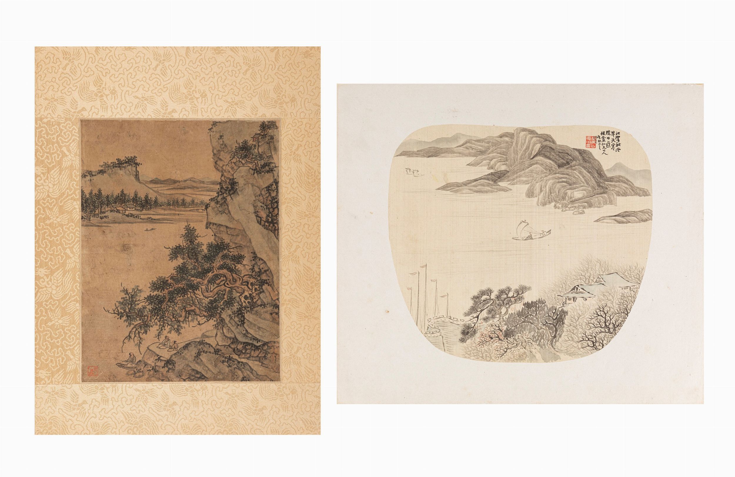 Cina, dinastia Qing (1644-1911) Raffiguranti quattro paesaggi lacustri con pagode e personaggi e una città tra le montagne. Due recano iscrizioni.