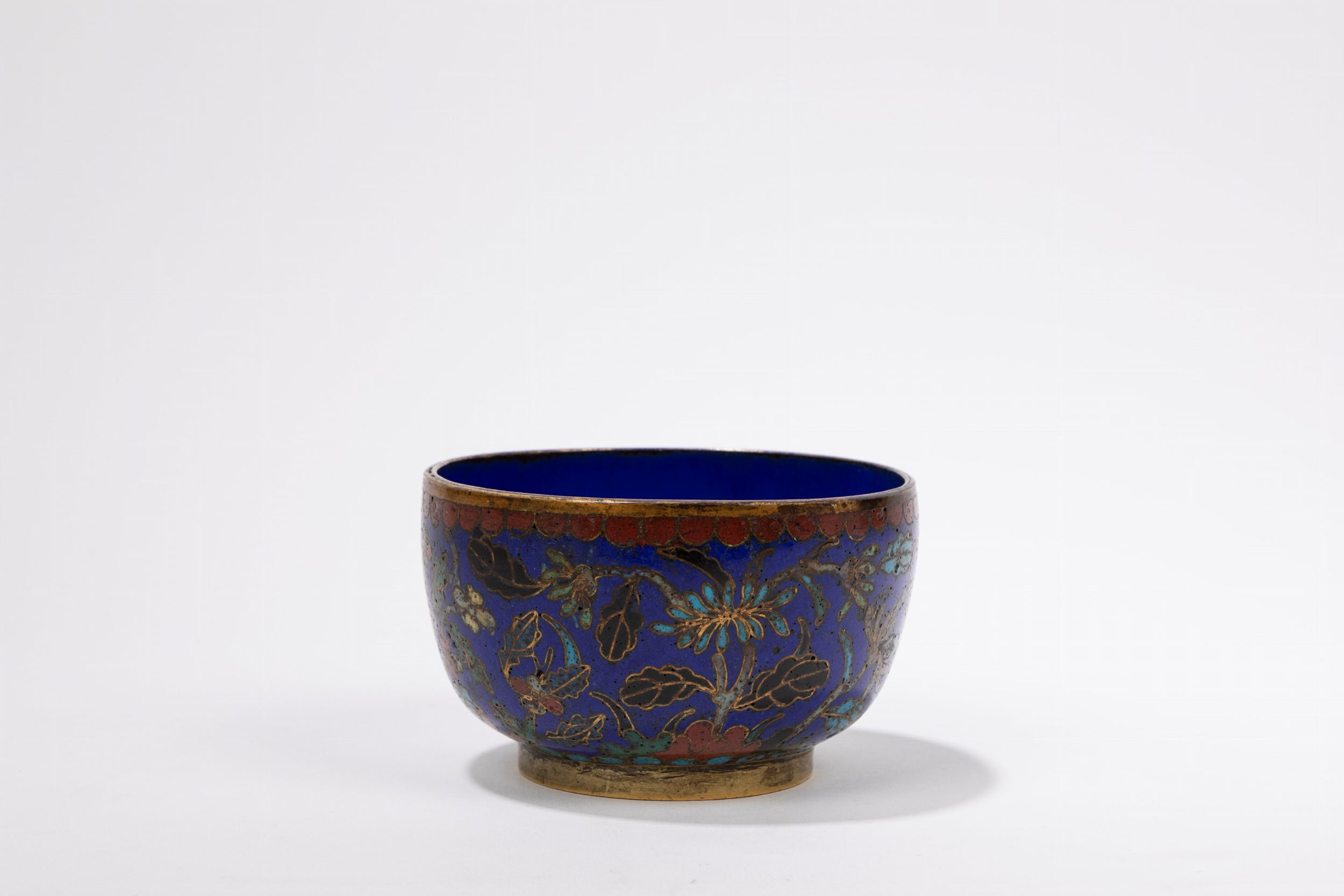 Cina, XVII / XVIII secolo A fondo blu come anche all'interno, è ben decorata con fiori, alberi e rocce in smalti policromi.Provenienza: dalla collezione del Professor Ferdinando Cappelletti.