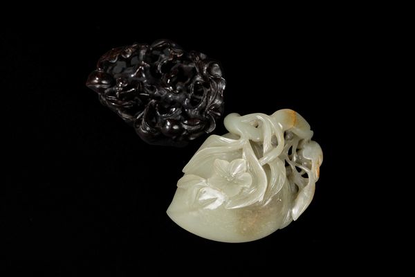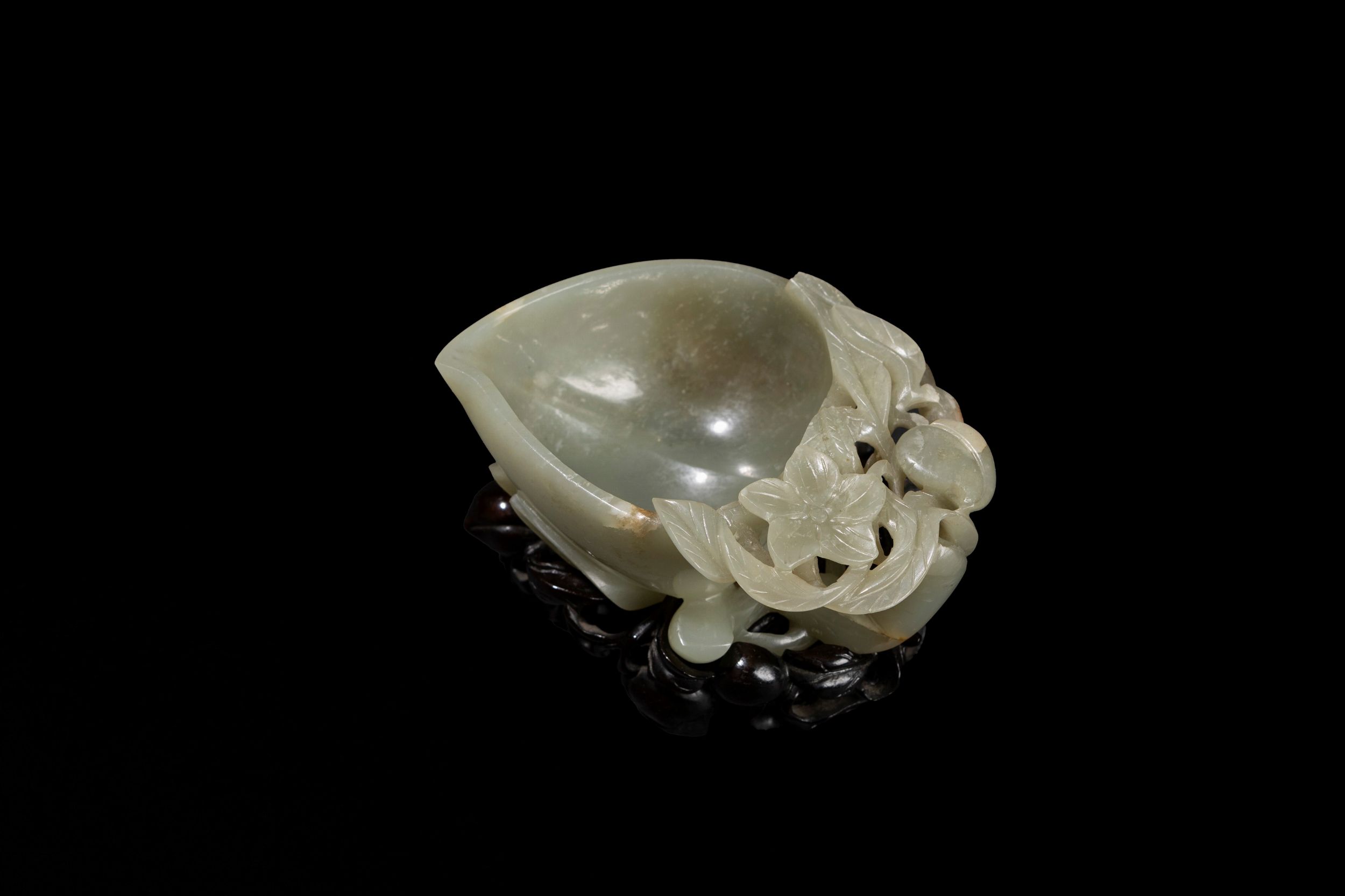 Cina, dinastia Ming, XVII secolo La coppa ha la forma di una pesca, mentre il manico è delicatamente intagliato a traforo con fiori e rami. Insieme al supporto originale in legno del XVIII secolo.