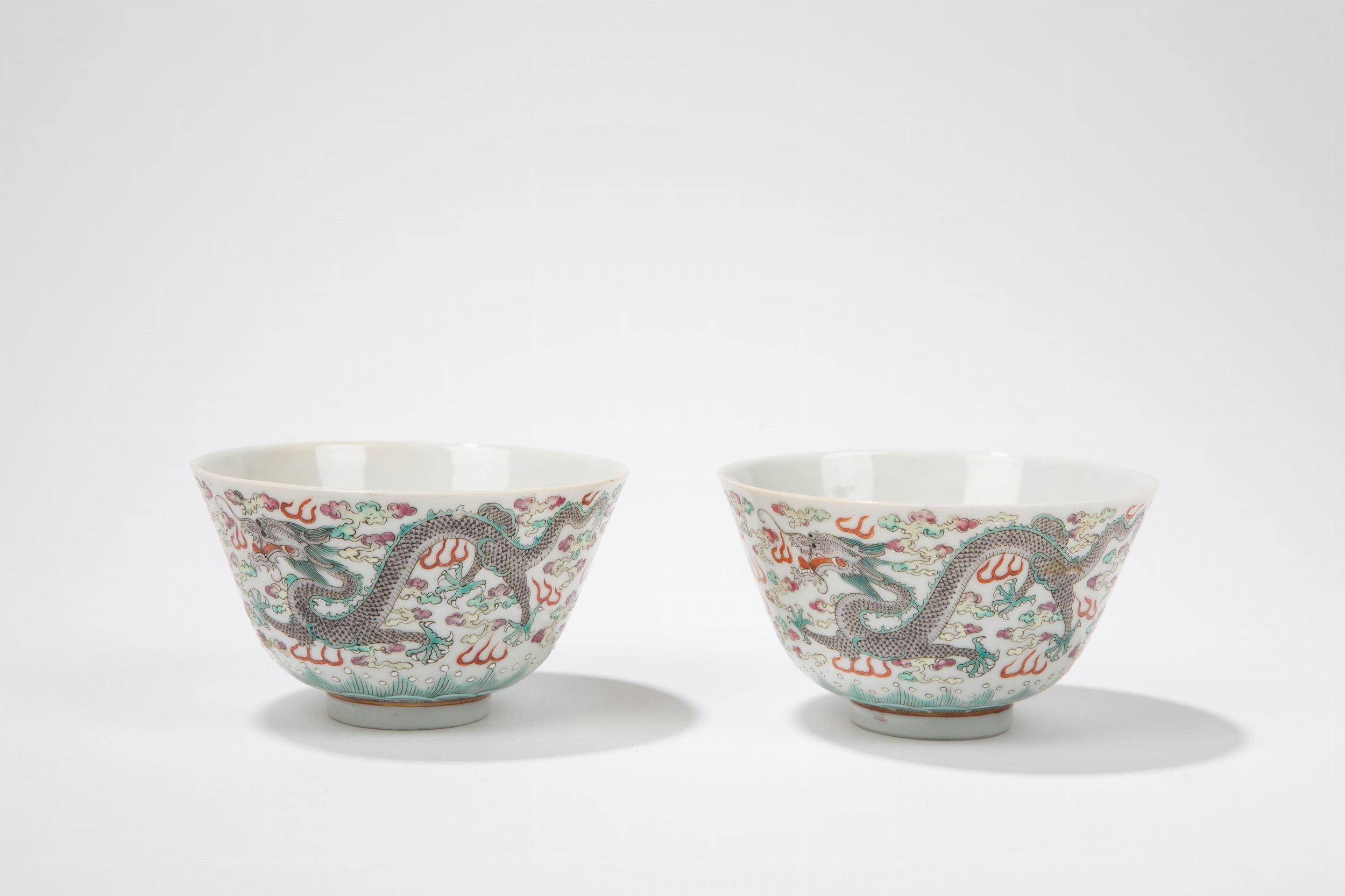 h cm 6,4 x d cm 18 Cina, fine XIX secolo / inizio XX secolo Ben dipinte nei colori della famiglia rosa con dragoni a cinque artigli tra le nuvole che inseguono la perla; sulla base recano il marchio apocrifo in rosso ferro a sei caratteri dell'Imperatore Yongzheng.
