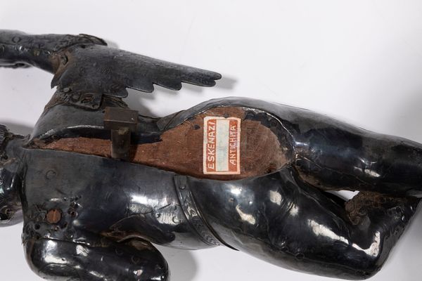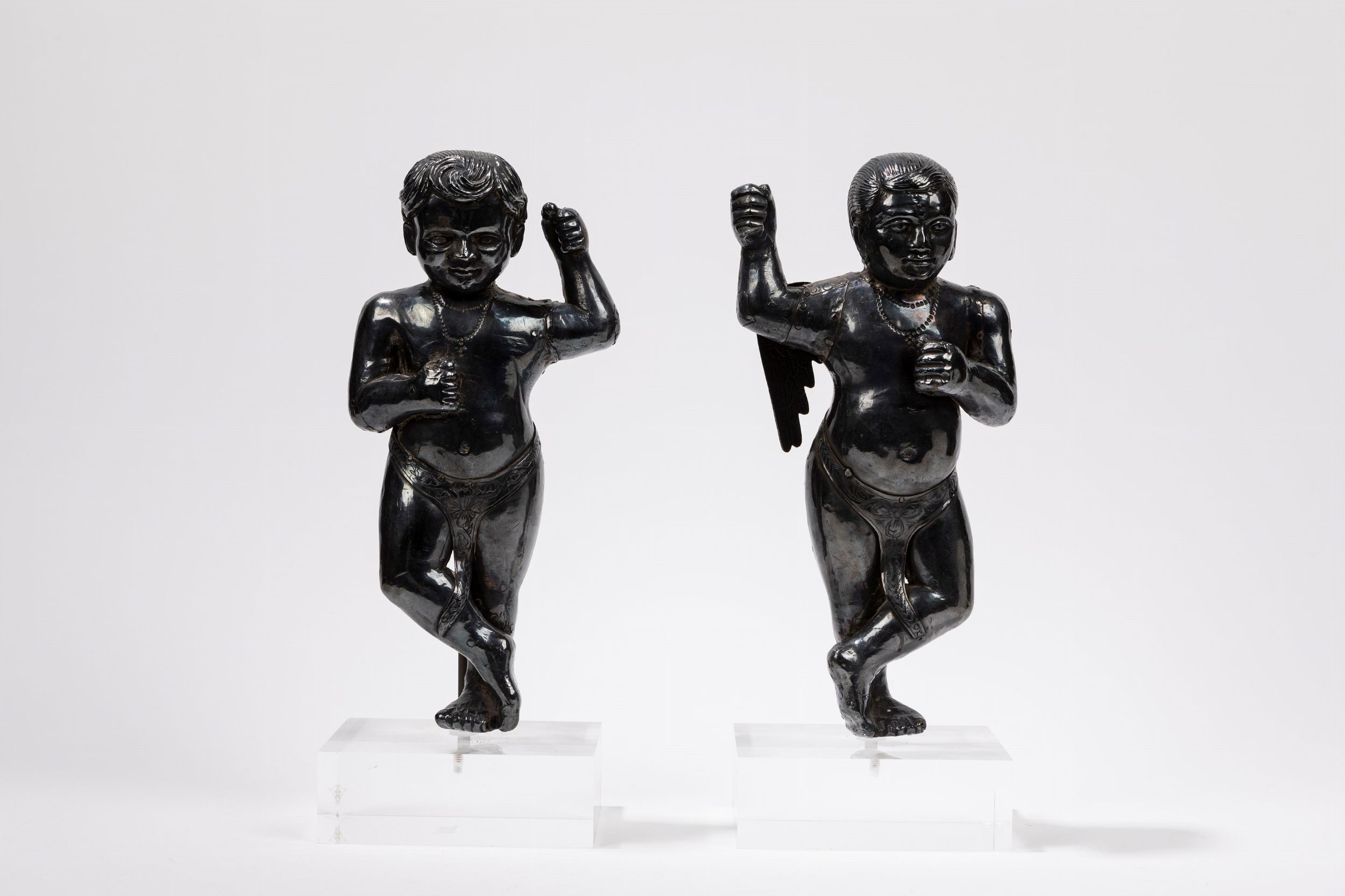 Asia, XIX secolo Scolpite su legno rivestito d'argento, raffigurano due personaggi in piedi. Una delle due figure reca etichetta Eskenazi sul retro.