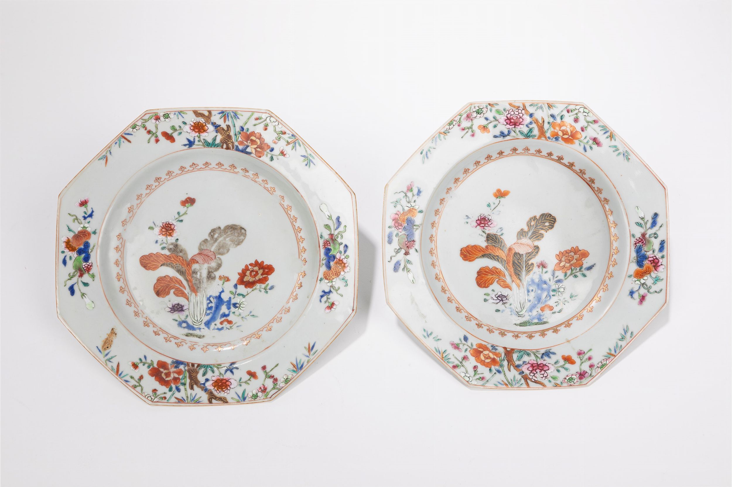 Cina, periodo Qianlong (1735-1796) Di forma ottagonale, sono dipinti con fiori, vegetali e rocce.