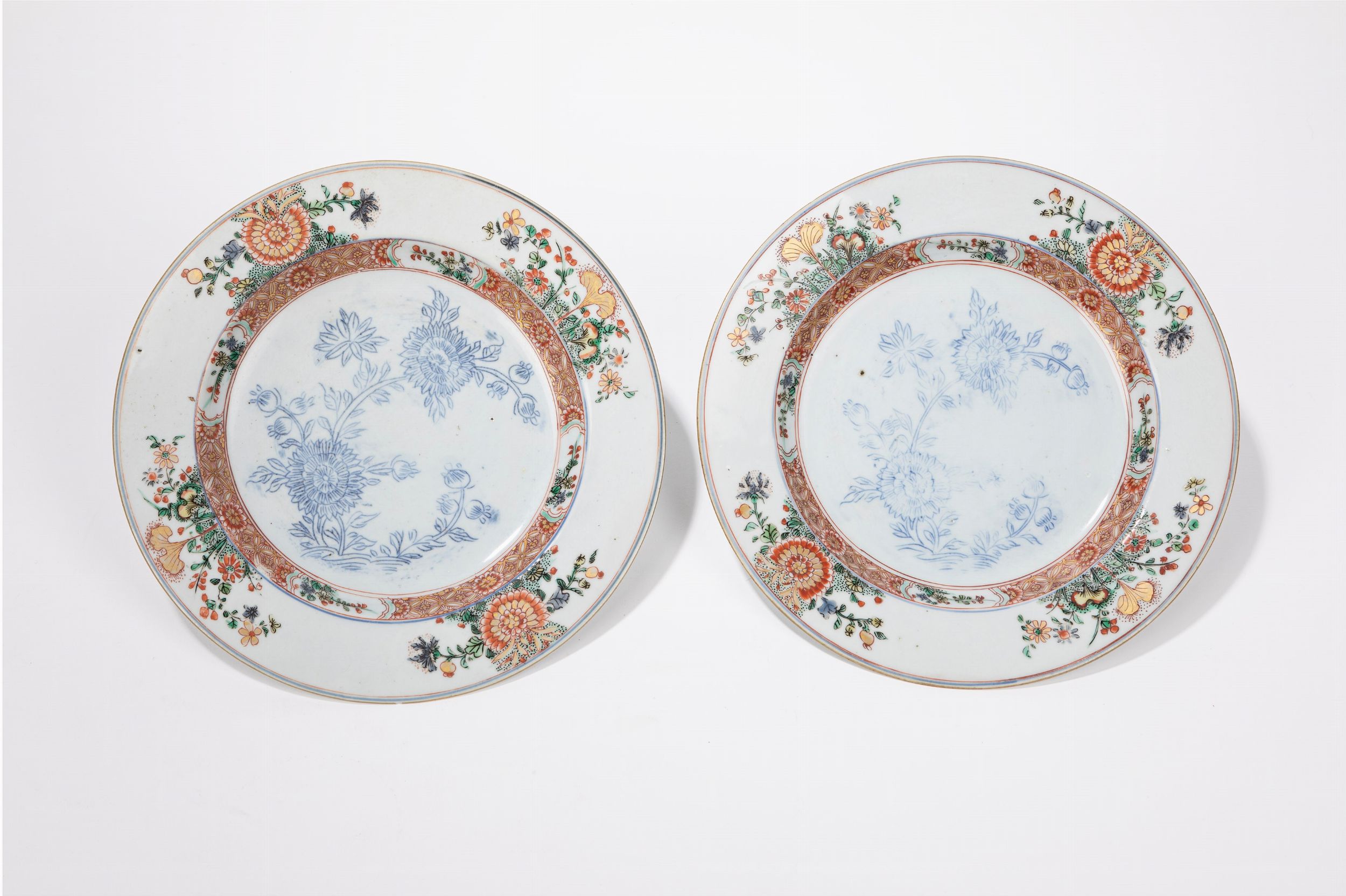 Ben dipinti al centro in blu sotto coperta con fiori; sul bordo sono decorati con smalti famiglia verde con fiori e funghi di lingzhi; sul retro sono presenti due rami fioriti in rosso ferro.Provenienza: da una collezione privata toscana.