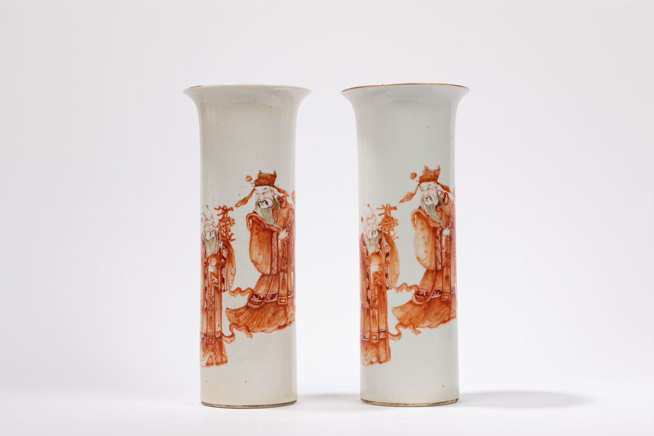 Cina, dinastia Qing, XIX secolo Dalla forma cilindrica con bordo svasato, sono dipinti in rosso con dei personaggi.