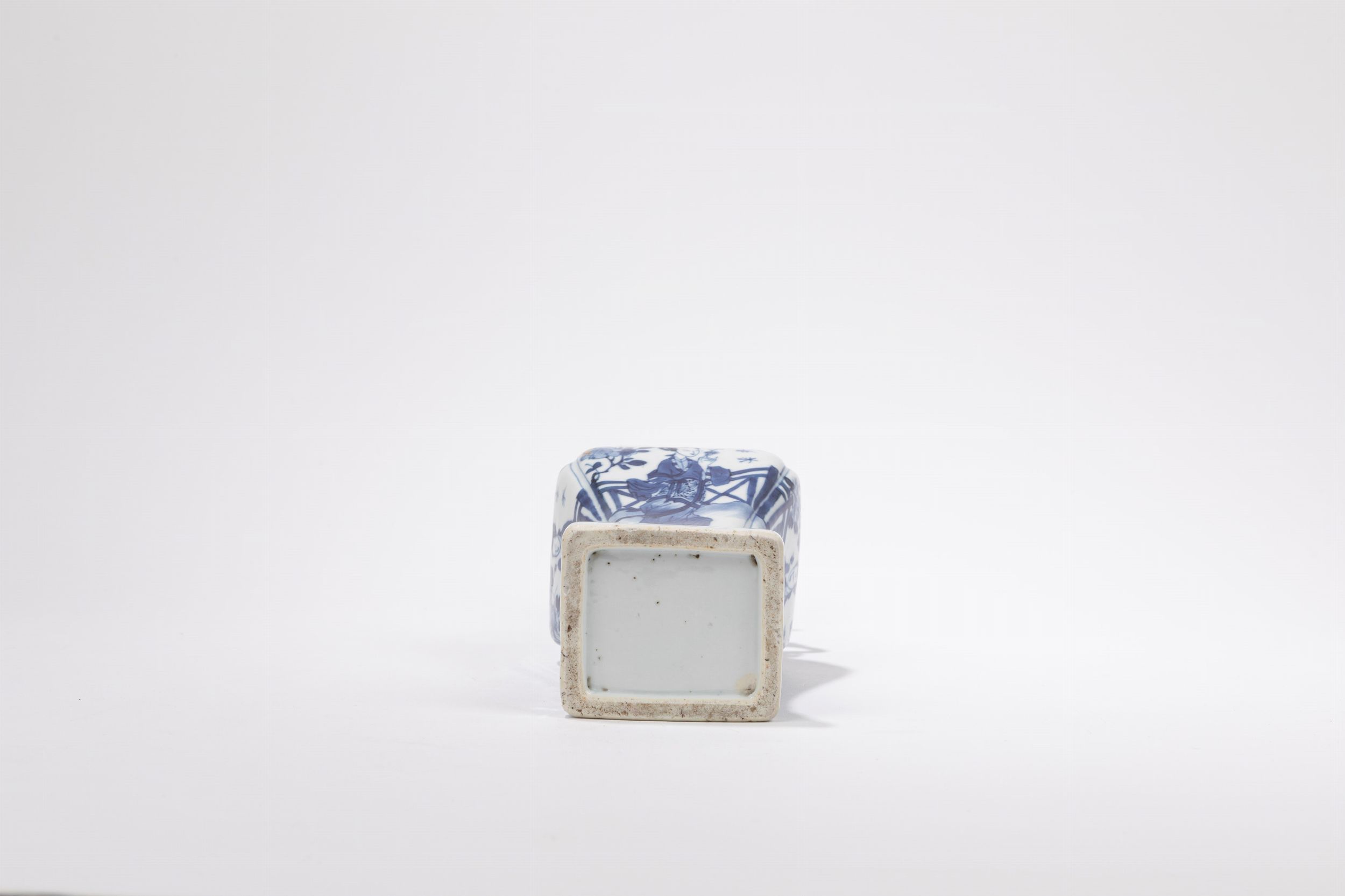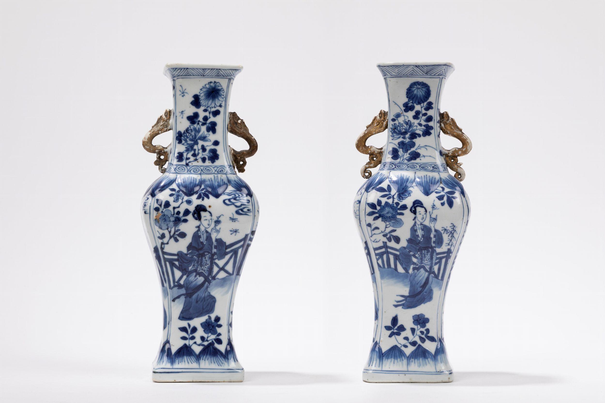 Cina, periodo Kangxi (1661-1722) Dalla forma a colonna di balaustra a sezione rettangolare con anse a forma di qilong, sono ben dipinti su ogni faccia del corpo con dame in giardini e sul collo con fiori.