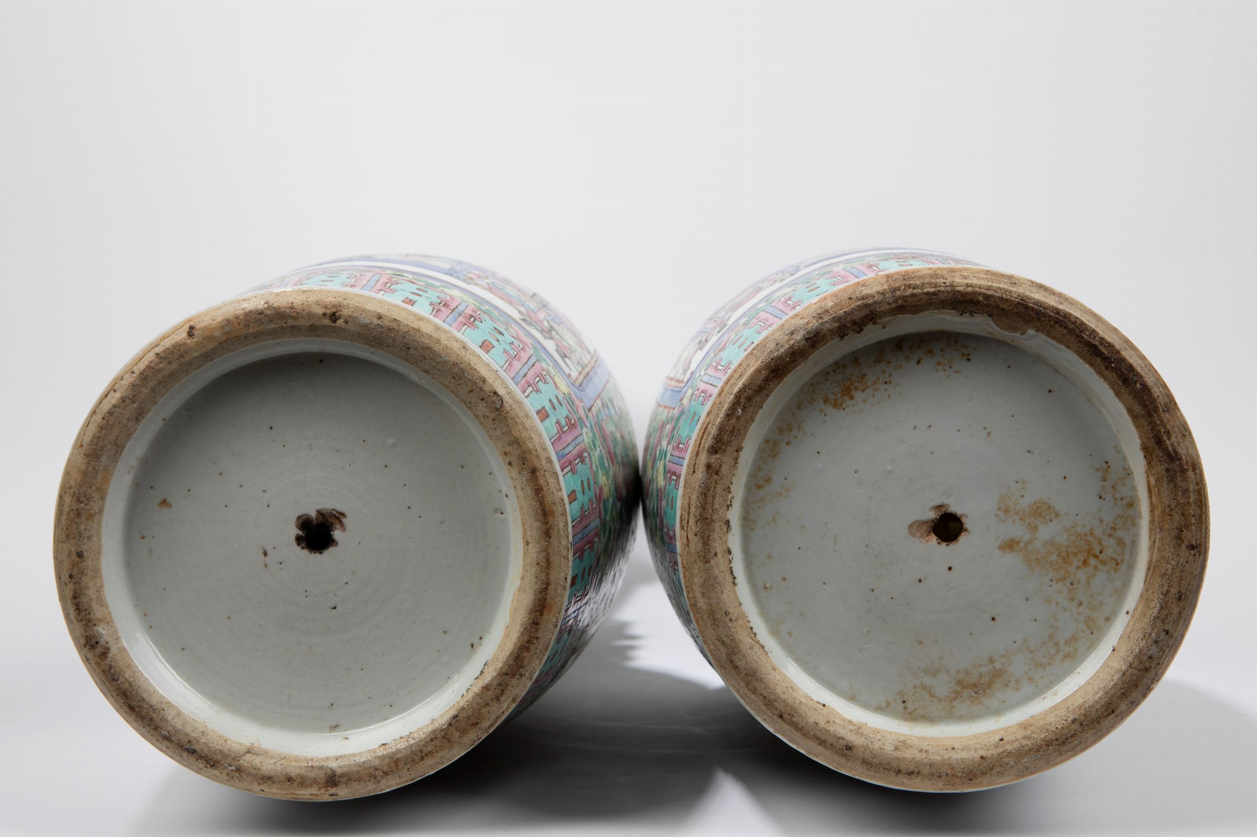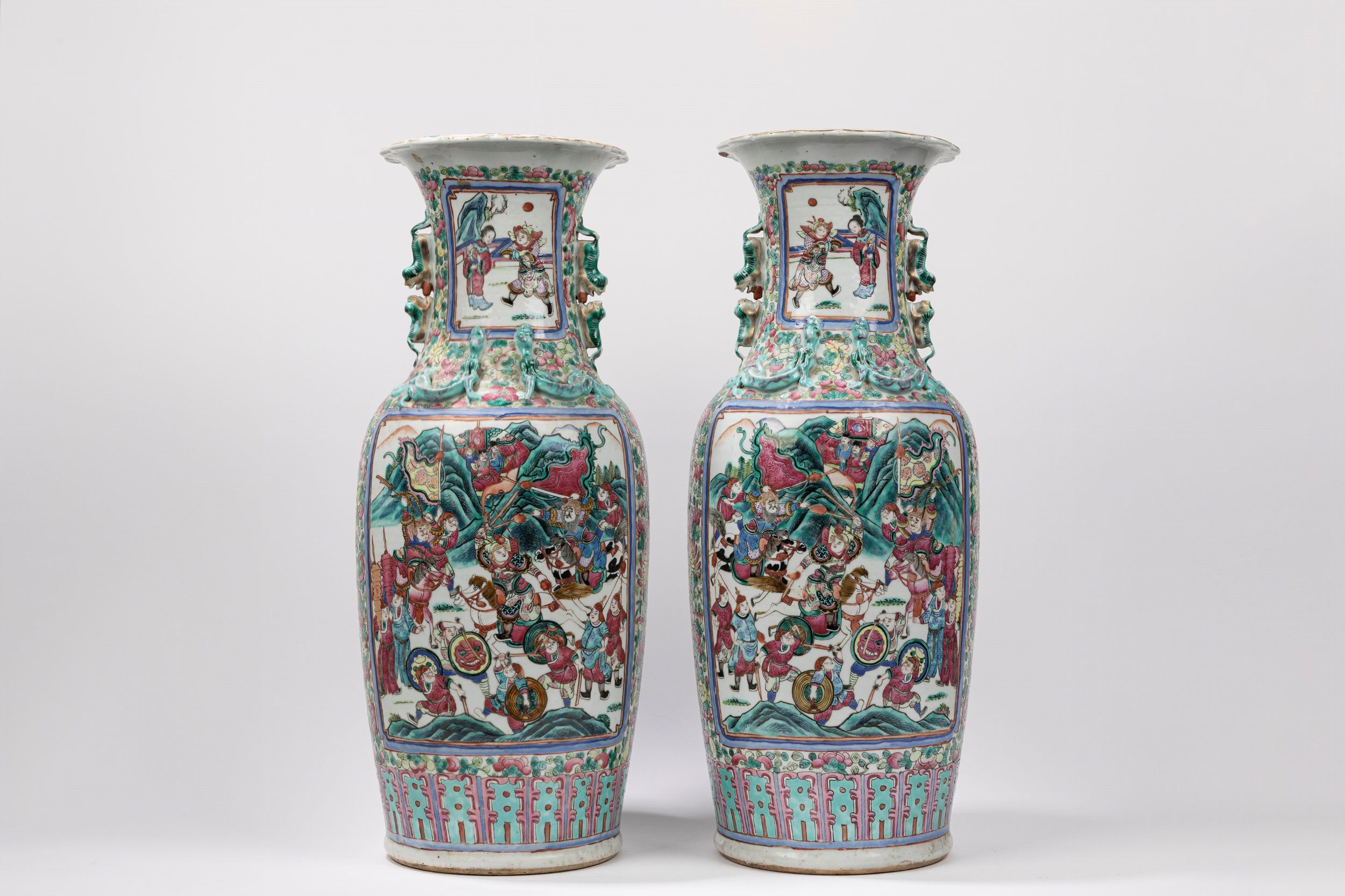 h cm 61 Cina, dinastia Qing, XIX secolo Dalla forma a colonna di balaustro sono decorati su un fondo floreale con riserve raffiguranti dignitari, combattenti, attendenti e scene di battaglia; alla base del collo dei piccoli draghi si arrampicano verso altre due riserve con guerrieri e dame; sui lati due coppie di anse leonine.