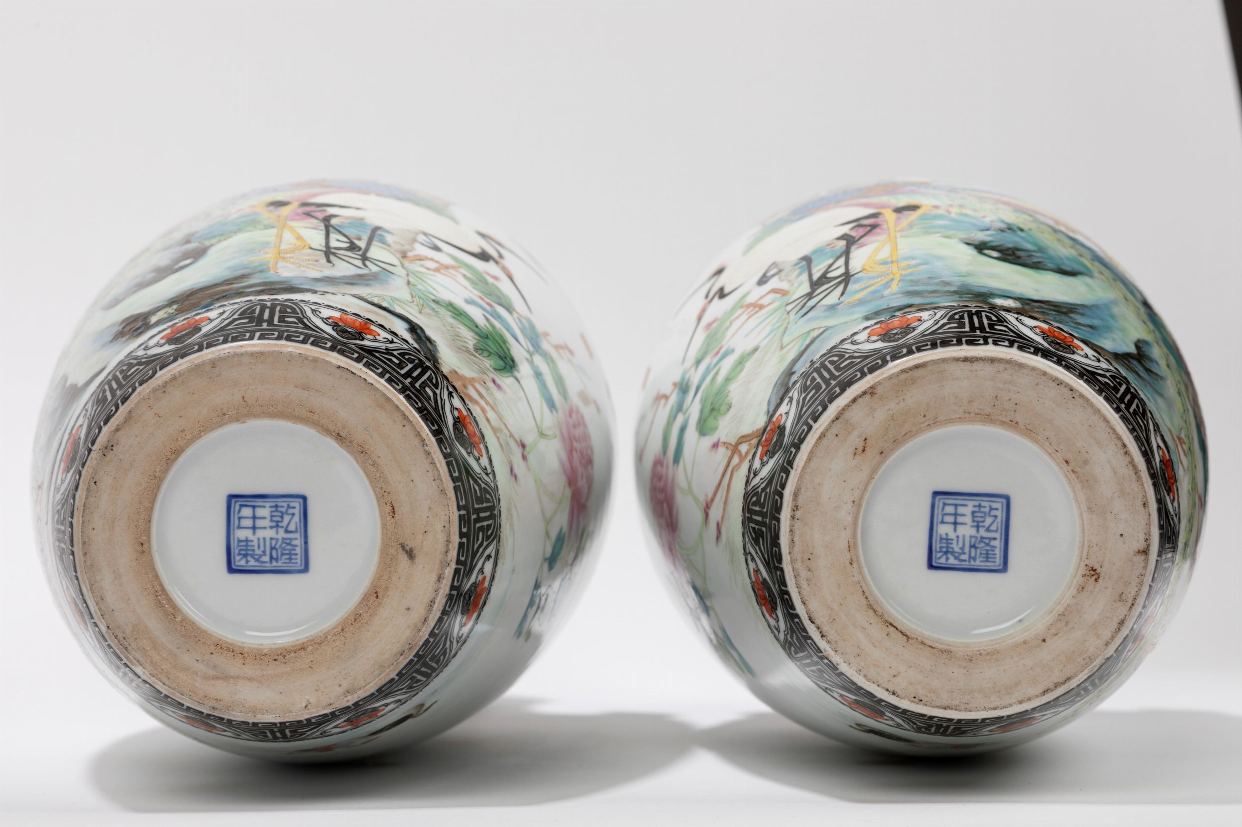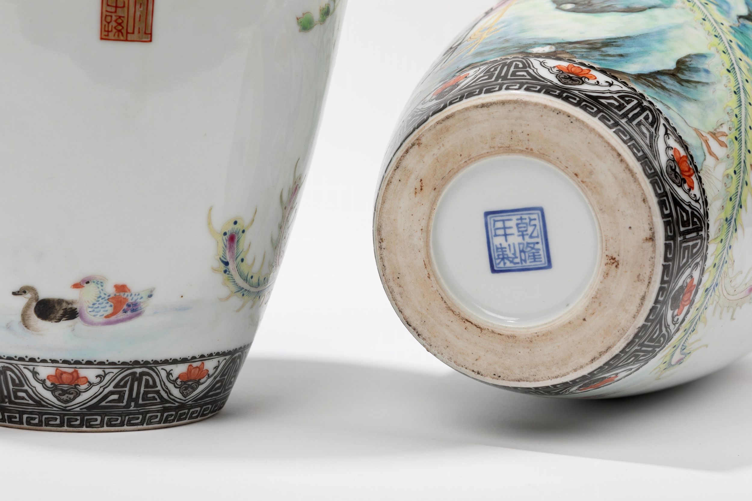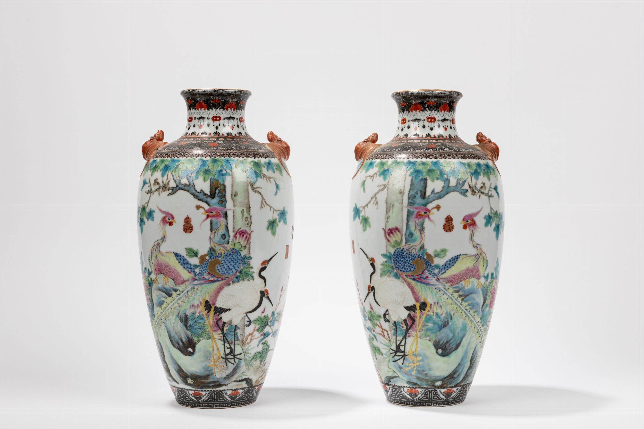 h cm 36 Cina, Repubblica di Cina (1912-1949) A forma di pseudo meiping con collo allungato con anse finemente modellate a forma di pipistrelli, sono ben decorati sul corpo con due fenici e due gru, quattro piccoli uccelli e un'anatra tra rocce, peonie e alberi; sul retro presentano delle iscrizioni e su tutto il corpo recano marchi in rosso ferro e dorati dell'Imperatore Qianlong, la scena è racchiusa da due fasce in encre de chine e rosso ferro con motivi floreali, greche, ruyi, trine e pipistrelli; al centro della base racchiuso da un largo piede ad anello recano i marchi apocrifi a quattro caratteri in blu sottocoperta dell'Imperatore Qianlong.