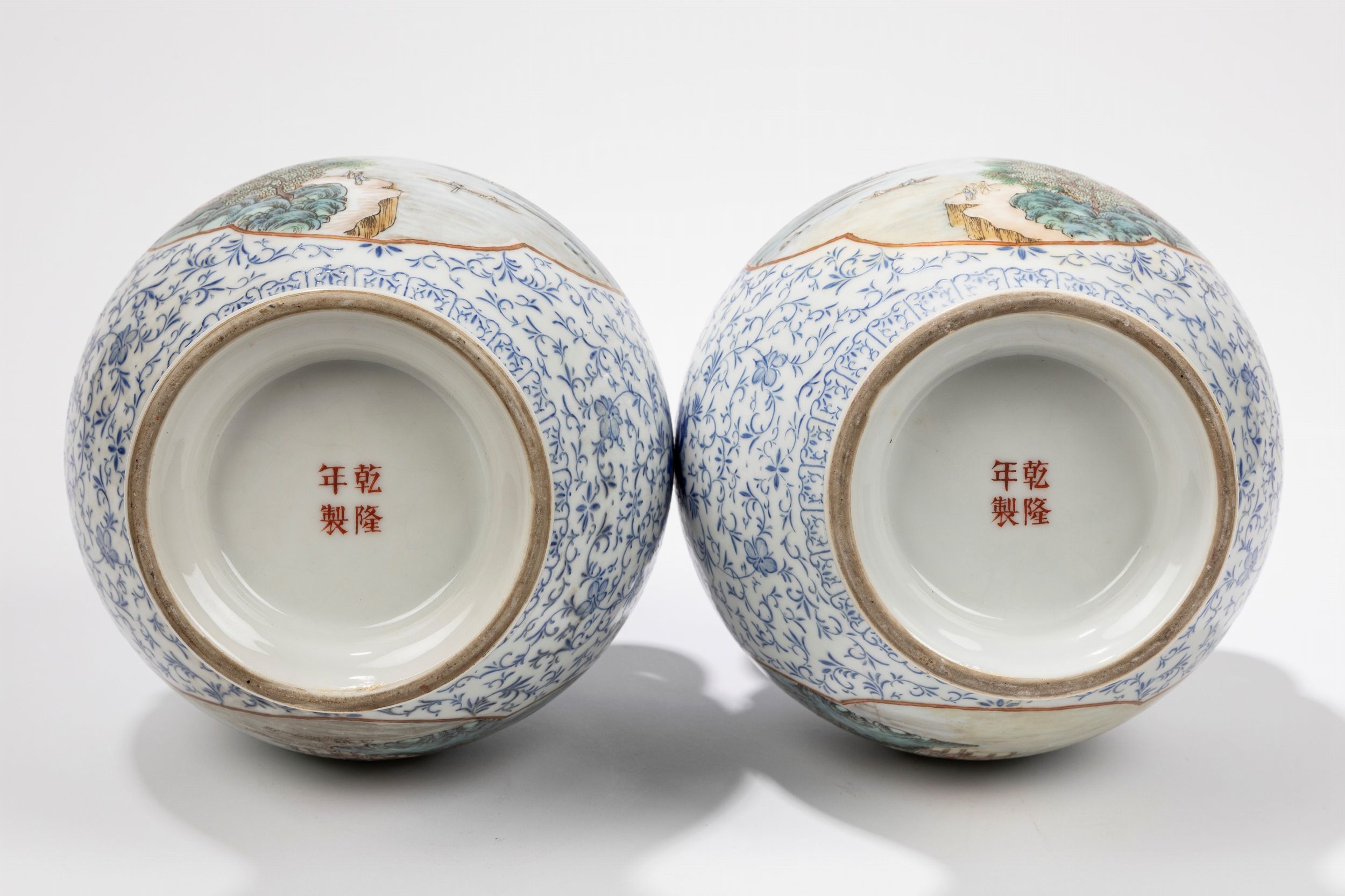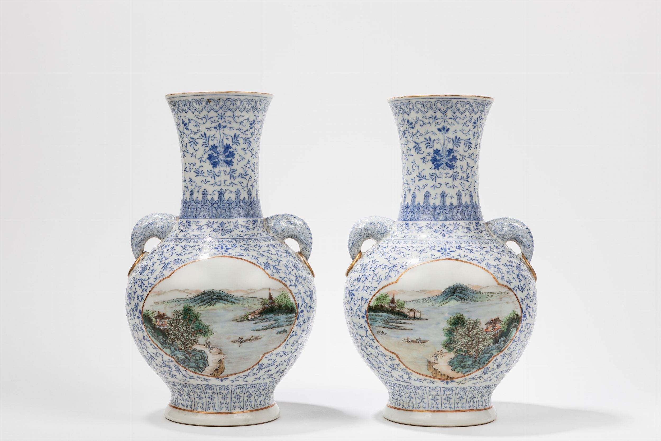 h cm 32,5 Cina, Repubblica di Cina (1912-1949) Dalla forma a colonna di balaustra, con anse a forma di testa di elefante che tengono tra le proboscidi degli anelli, sono ben dipinti in blu sopra coperta con scroll di fiori di loto e foglie; al centro del corpo globulare sono dipinti due bei paesaggi all'interno di riserve lobate; al centro della base recano il marchio apocrifo a quattro caratteri in rosso ferro dell'Imperatore Qianlong.
