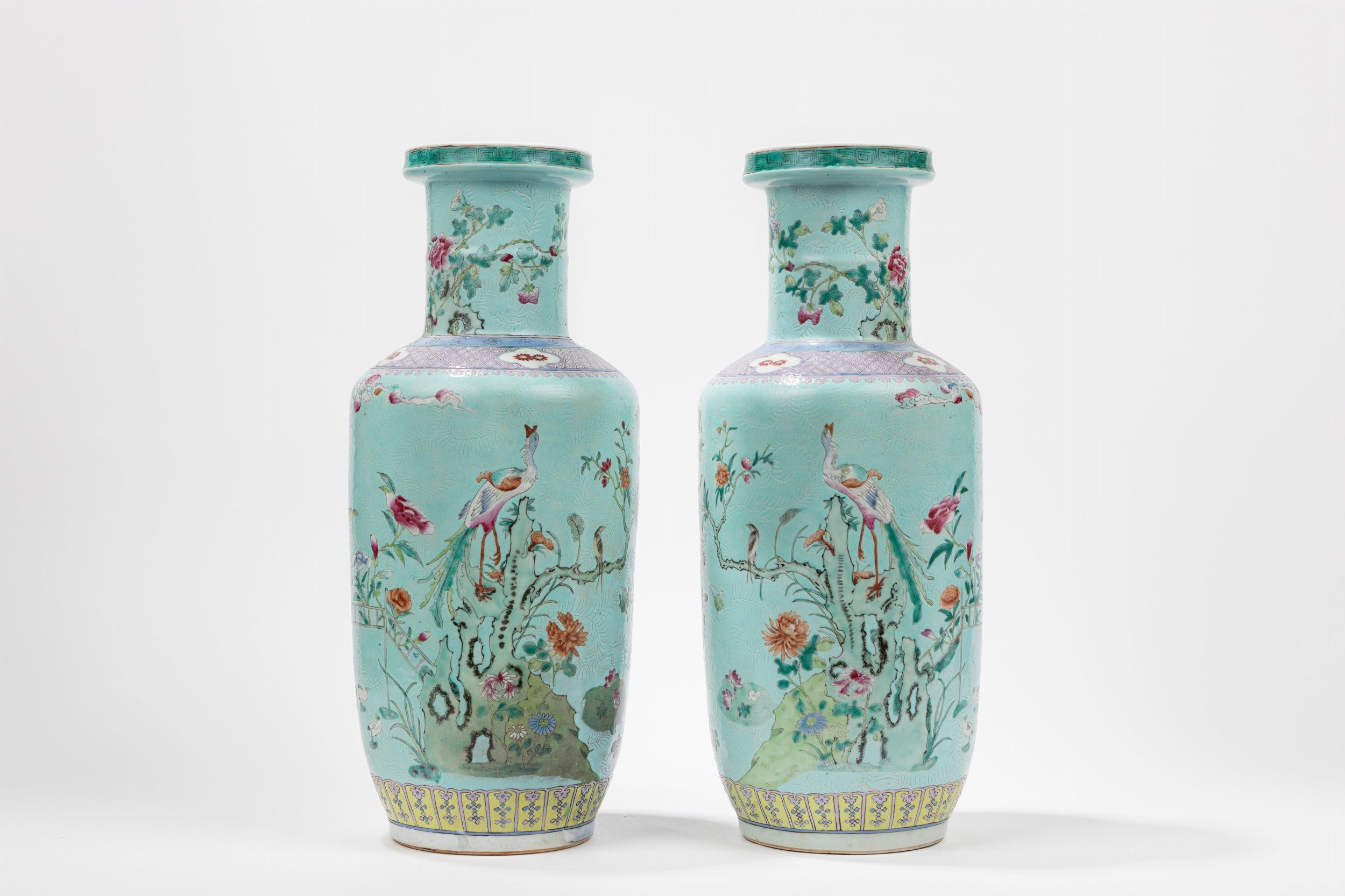 Cina, inizio XX secolo Decorati su fondo turchese sgraffito, sono ben dipinti con uccelli tra rocce, alberi e fiori.
