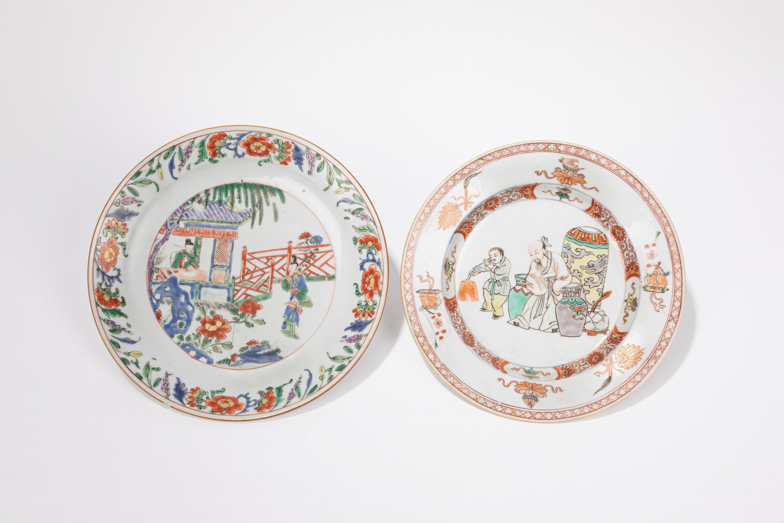 d cm 23 Cina, dinastia Qing, XVIII secolo Uno decorato con una classica scena di 'Long Eliza'; l'altro con un saggio e un attendente tra oggetti antichi, il retro decorato con quattro fiori in rosso ferro.Provenienza: da una collezione privata toscana.