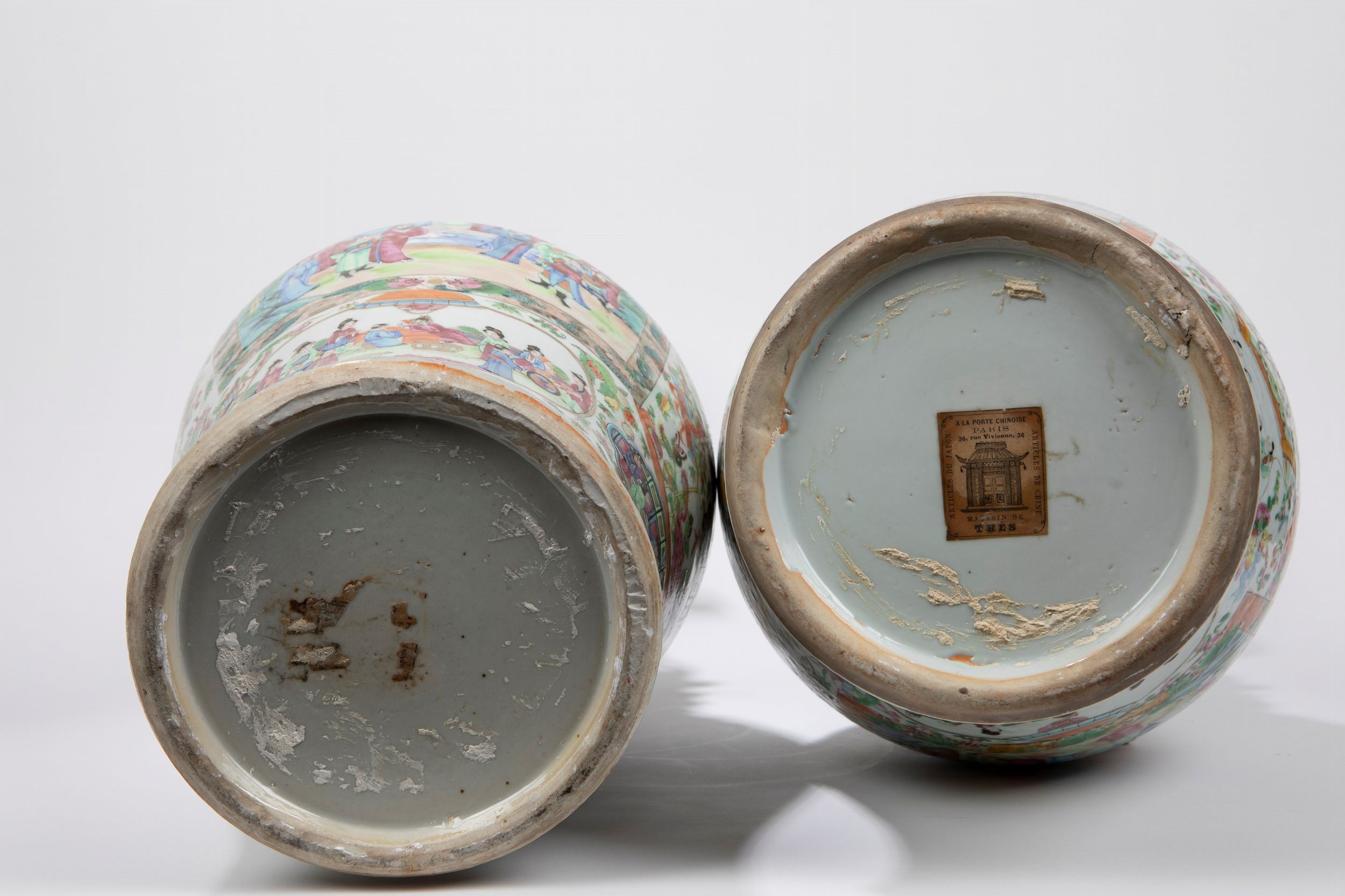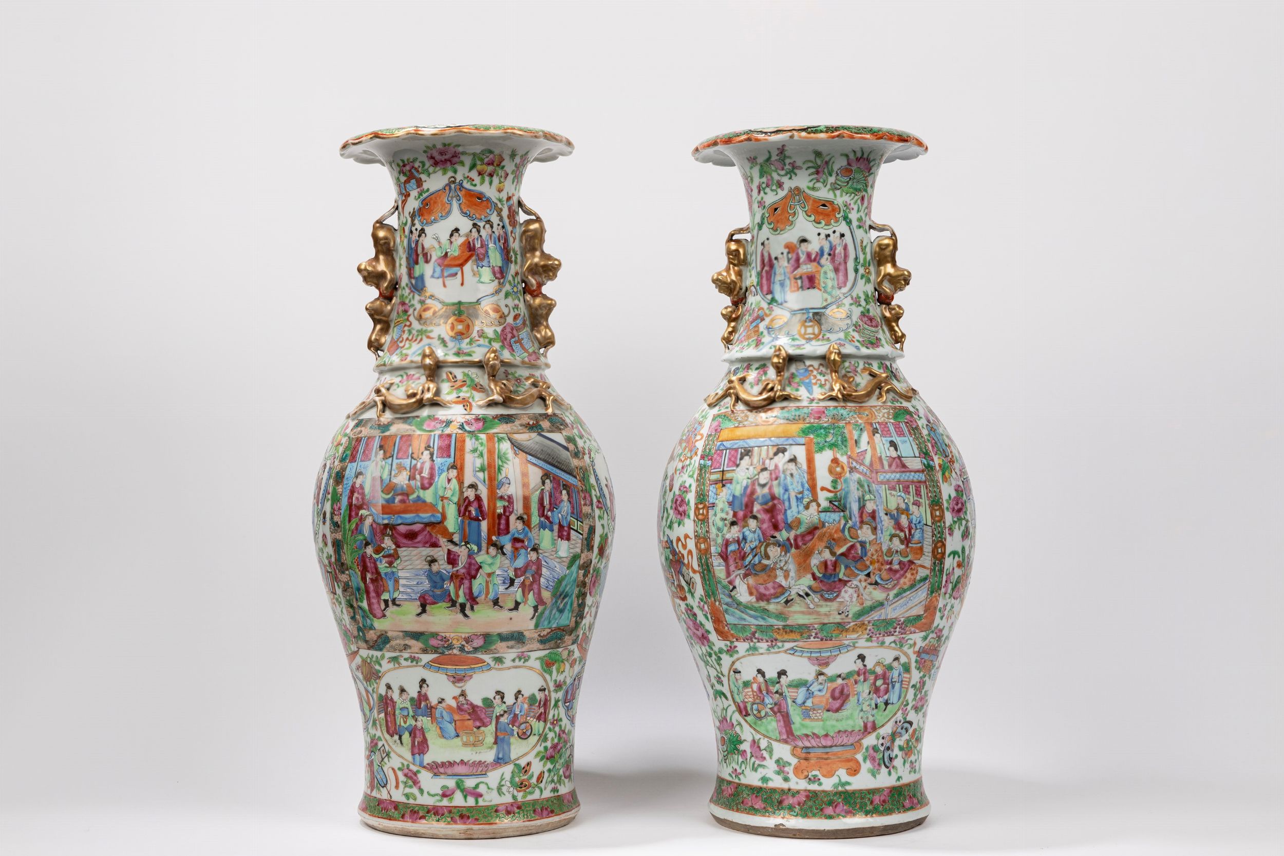 h cm 60 Cina, dinastia Qing, XIX secolo Di forma a colonna di balaustra con bordo svasato e anse a forma di leone, sono ben dipinti sul corpo e sul collo con riserve con all'interno dei personaggi, mentre il resto del corpo è decorato col classico motivo floreale cantonese rose medallion.
