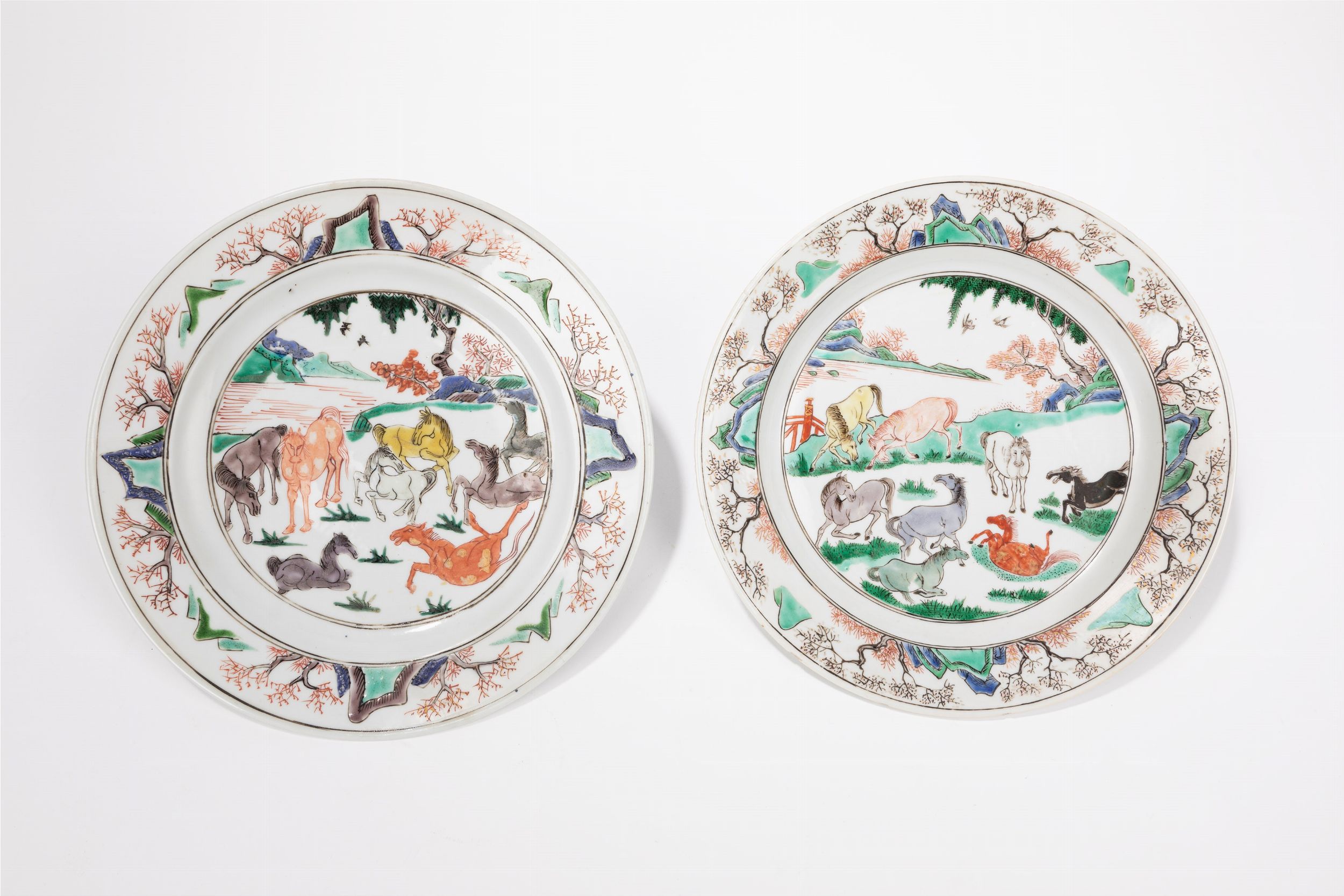 d max cm 22 Cina, periodo Kangxi (1661-1722) Entrambi ben dipinti con al centro gli otto cavalli di Wang Mu in un paesaggio, sul bordo sono decorati con rami e rocce; sulla base recano marchi in blu sotto coperta all'interno di doppi cerchi uno a forma di fiore e uno a forma di oggetto antico, sono presenti etichette di Antichità Perotto.Provenienza: acquistato da una collezione privata italiana da Antichità Perotto a Milano alla fine degli anni '80.Note di catalogo:Si veda il catalogo di Perotto, Internazionale dell'Antiquariato, Fiera di Milano, Milano 1986, pag. 78-79.