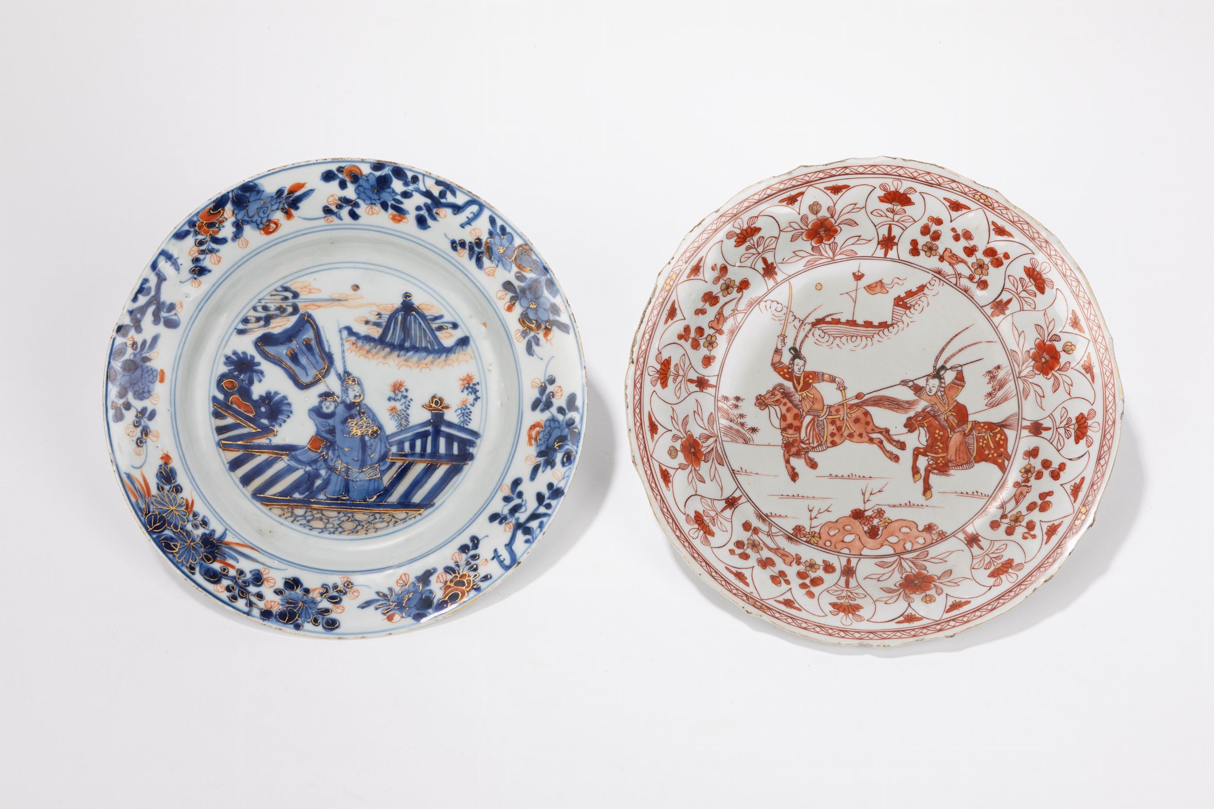 d max. cm 22,5 Cina, periodo Kangxi (1661-1722) Uno in stile 'sangue e latte' lobato e modellato, è finemente dipinto in rosso e oro con due donne armate a cavallo che combattono, sul retro sono presenti due rami fioriti stilizzati; l'altro imari ben dipinto con dei personaggi in un giardino, sul retro sono presenti tre rami in blu sotto coperta, al centro della base reca un marchio con un oggetto buddhista all'interno di un doppio cerchio.Provenienza: da una collezione privata toscana.