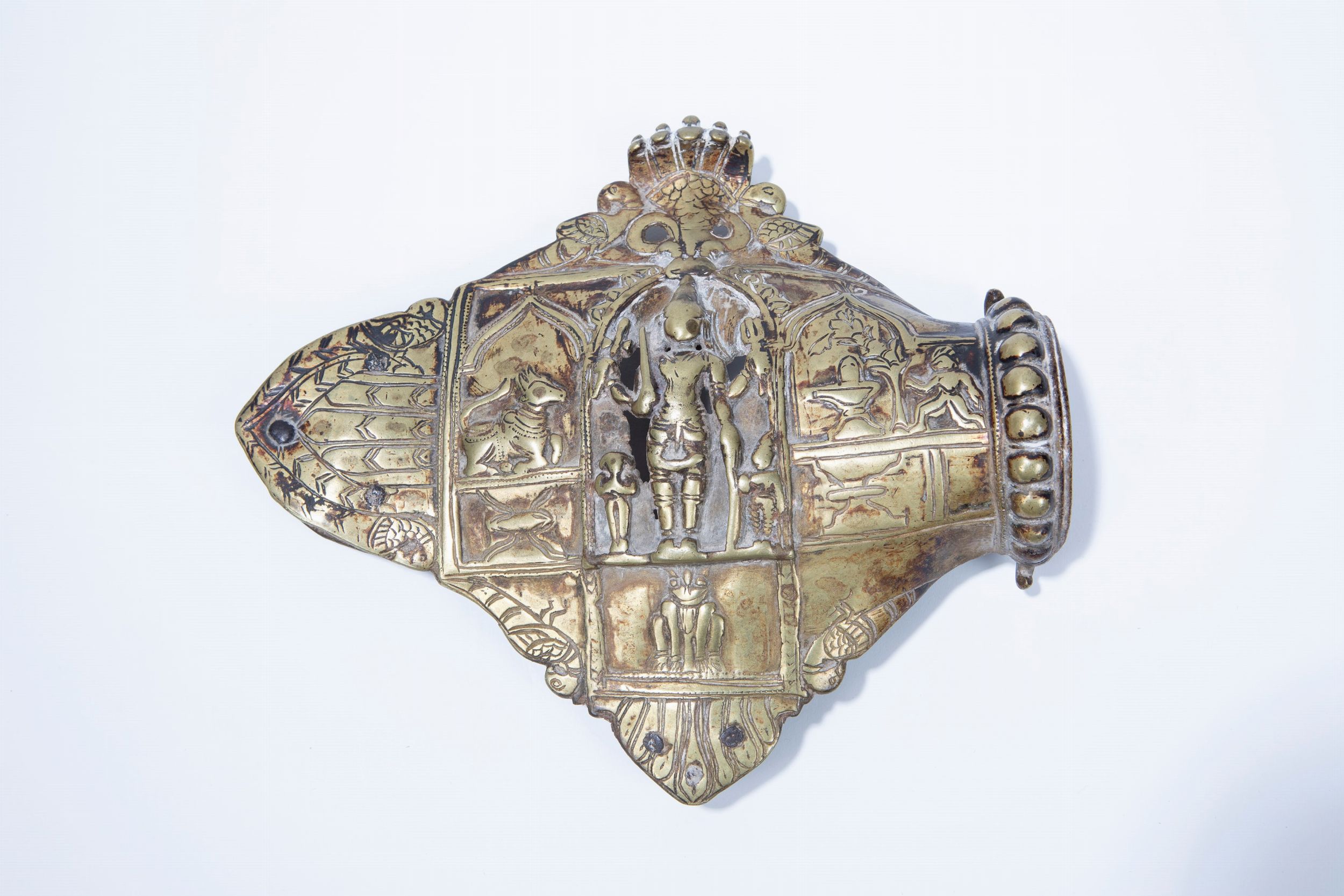 h cm 21 x l cm 18,5 India, Karnataka, XVIII secolo Sbalzata raffigura Virabhadra.Note di catalogo:Il seguente oggetto è stato pubblicato su Arts of Asia, Autunno 2022, pag. 86.La diffusione del culto di Virabhara, manifestazione terrifica di Shiva e guerriero invincibile, non fu solo una questione religiosa ma collegata anche allo scontro tra regni indù dell'India centrale e meridionale e l'impero islamico della dinastia Moghul. Molte armi furono quindi decorate con l'immagine di Virabhadra in modo da renderle anch'esse invincibili.