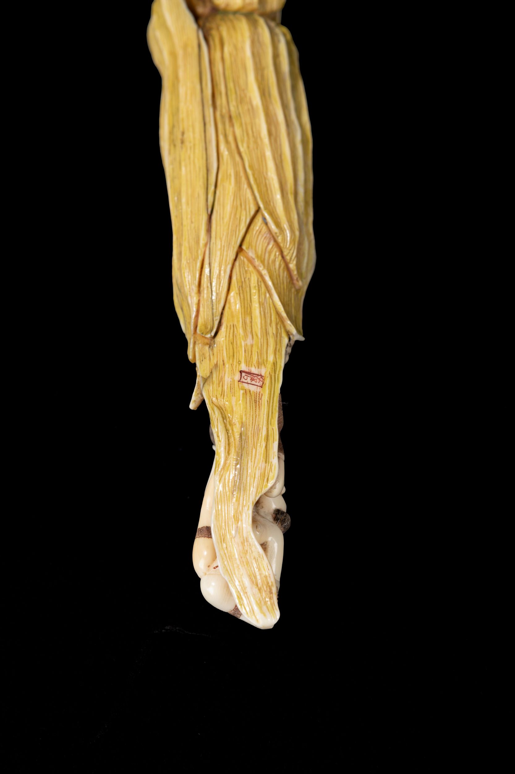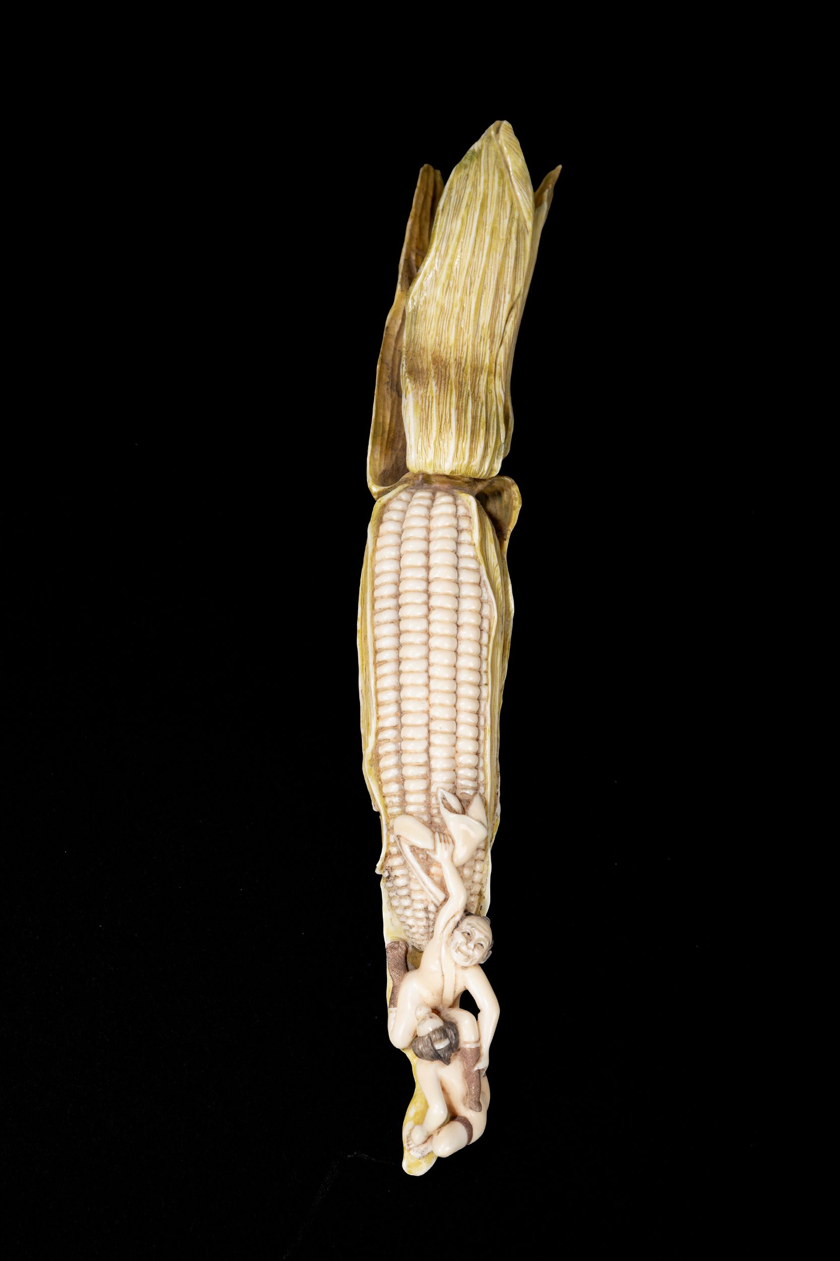 Giappone, periodo Meiji (1868-1912) Con tracce di policromia, raffigurante una pannocchia parzialmente sbucciata che termina con una scena erotica.