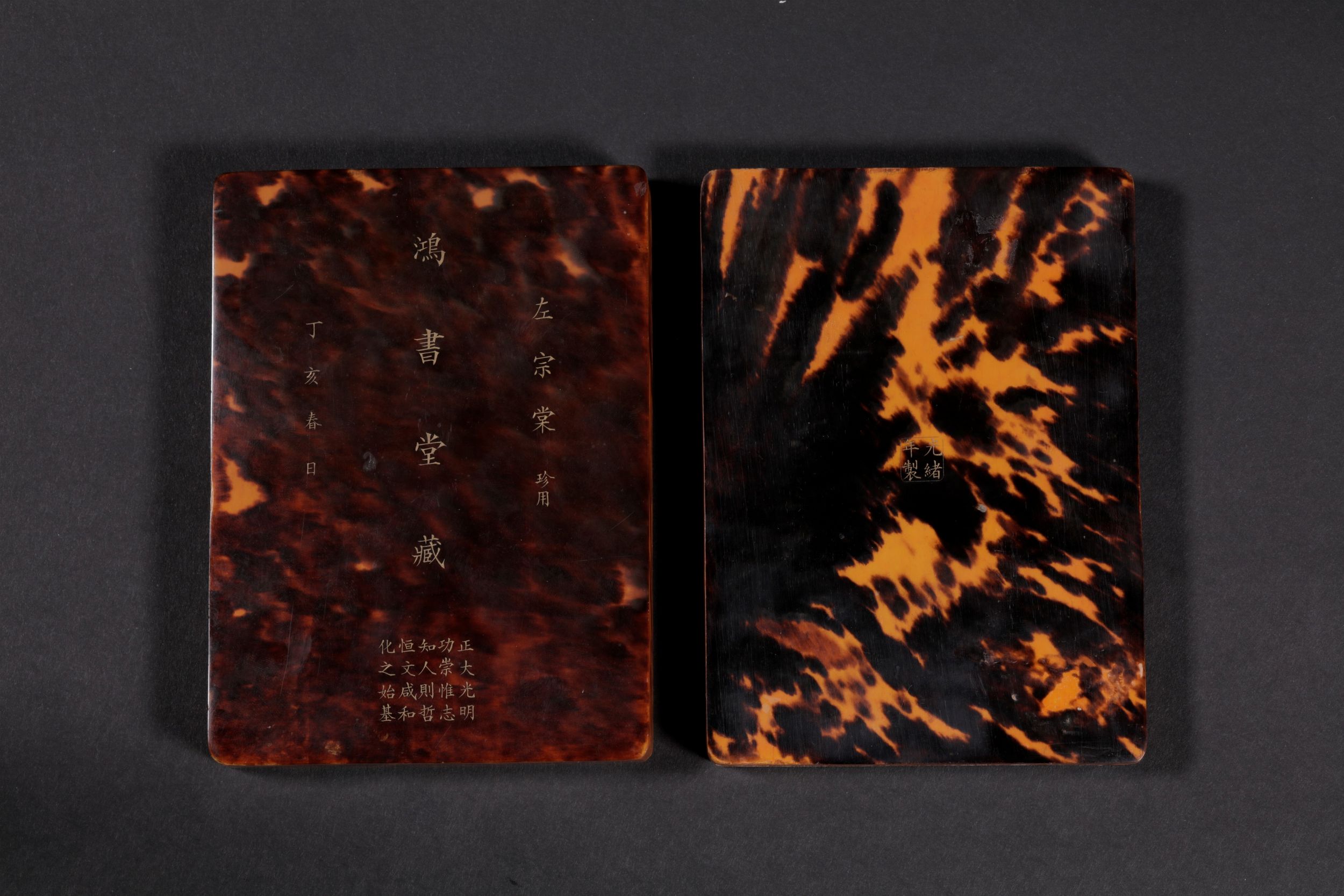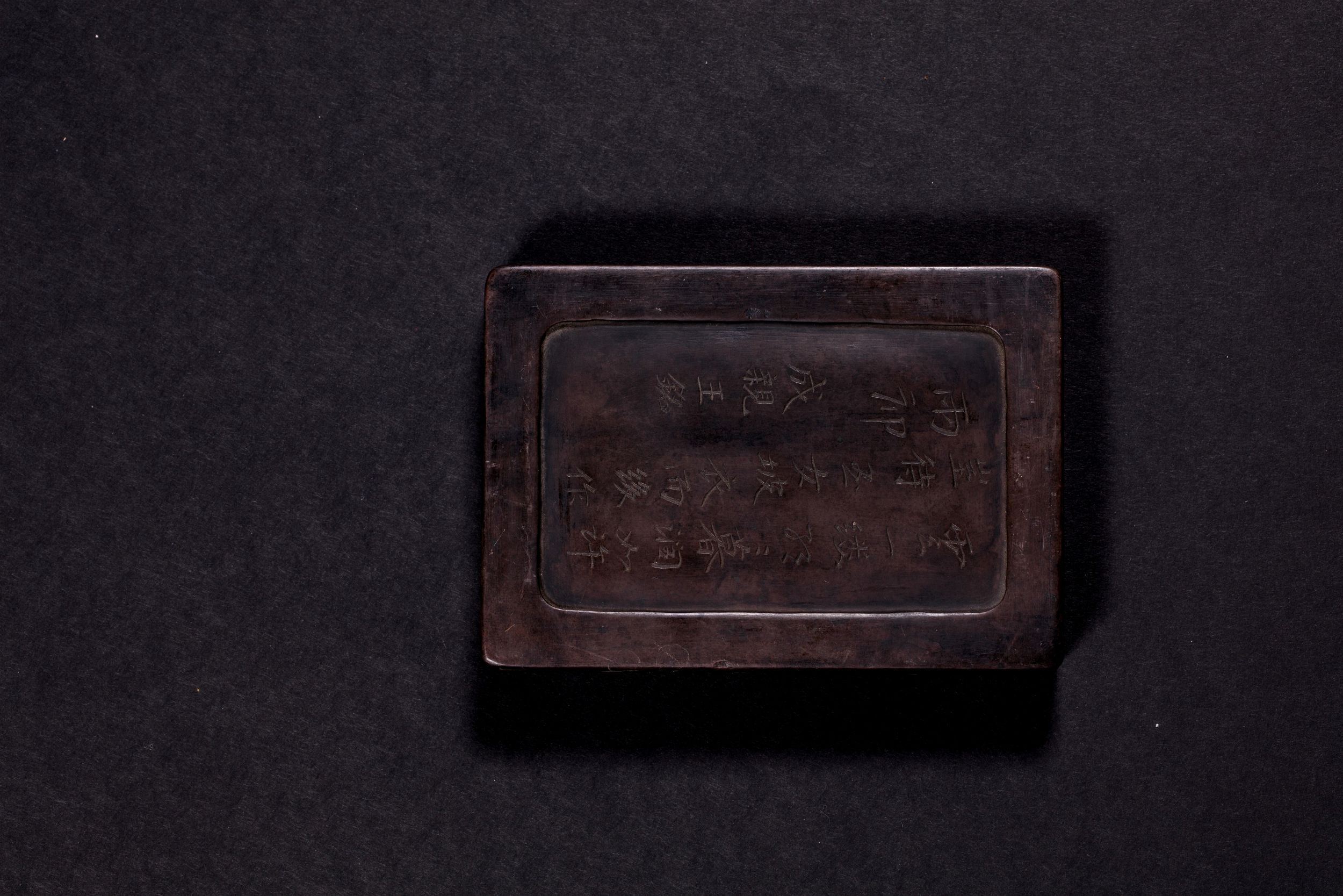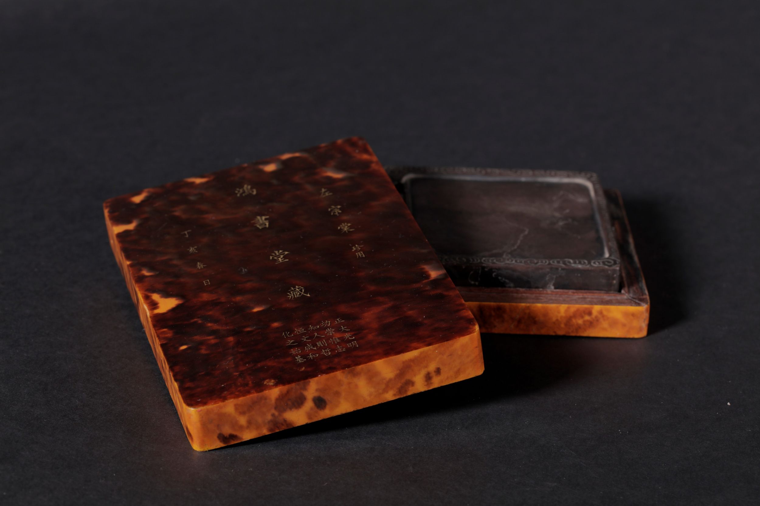 h cm 3,5 x l cm 15 Cina, marchio e periodo Guangxu (1875-1908) Di forma a parallelepipedo, il legno è completamente foderato da uno strato di guscio di tartaruga che reca su un lato delle iscrizioni dorate e sulla base il marchio sigillare a quattro caratteri dorato dell'Imperatore Guangxu, all'interno è presente una pietra per inchiostro.
