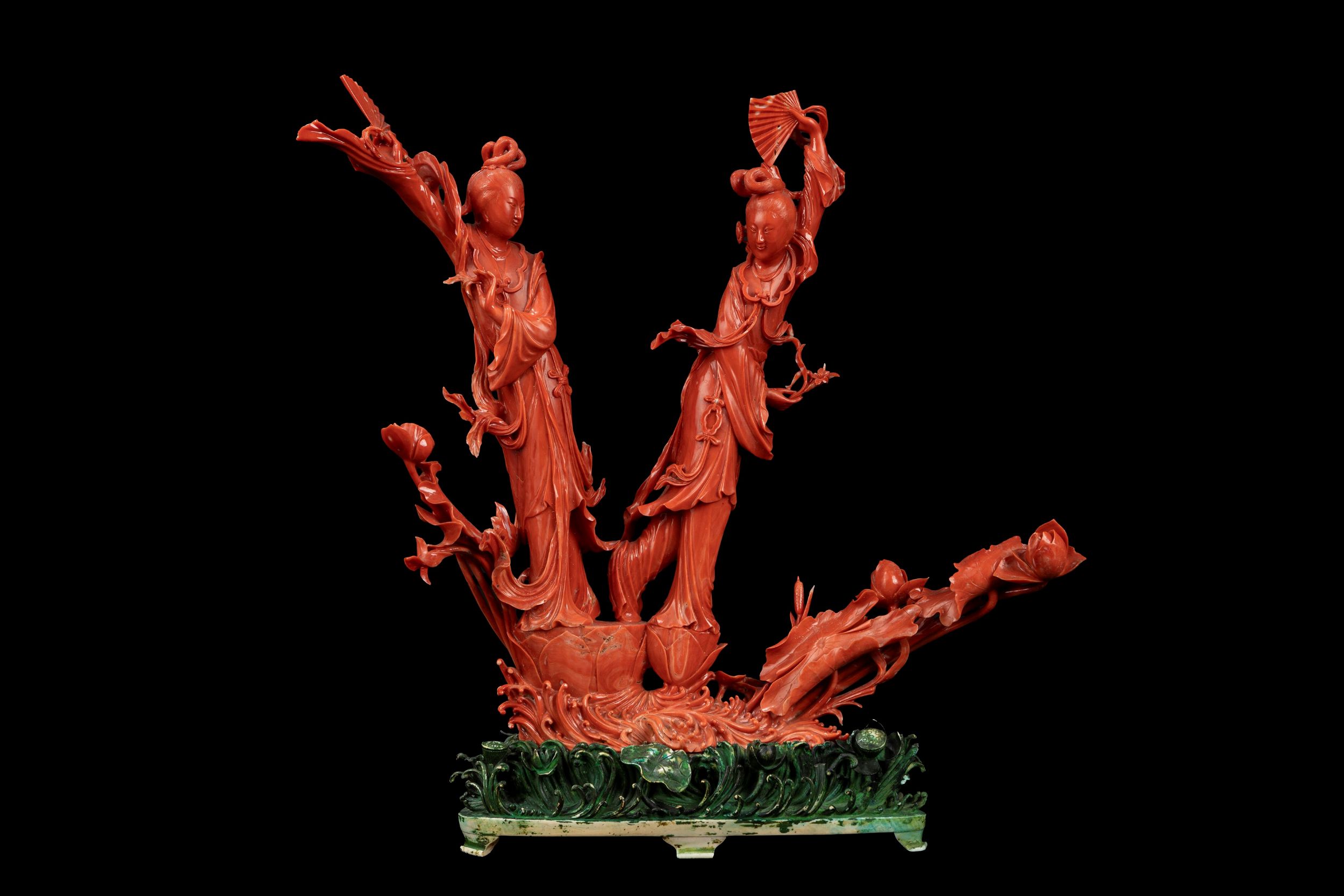 Cina, dinastia Qing, fine XIX secolo Ben intagliato con quattro rami, sono raffigurate dame e fiori; poggia sulla sua base in avorio dipinta. Peso tot. 2795.Lotto provvisto di certificazione CITES.