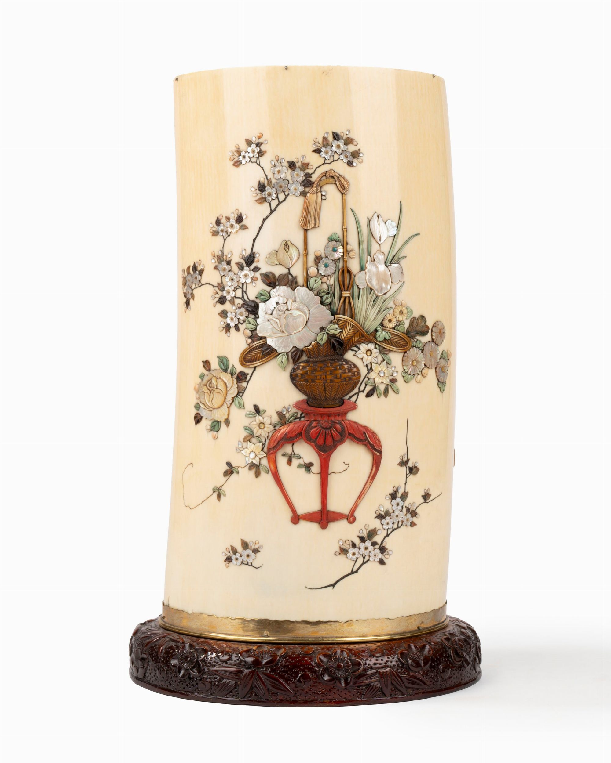 Intarsiato in avorio, madreperla e pietre dure su base lignea; la decorazione frontale anteriore rappresenta un tripode mentre la decorazione frontale posteriore rappresenta fior; firmato sul lato destro.
