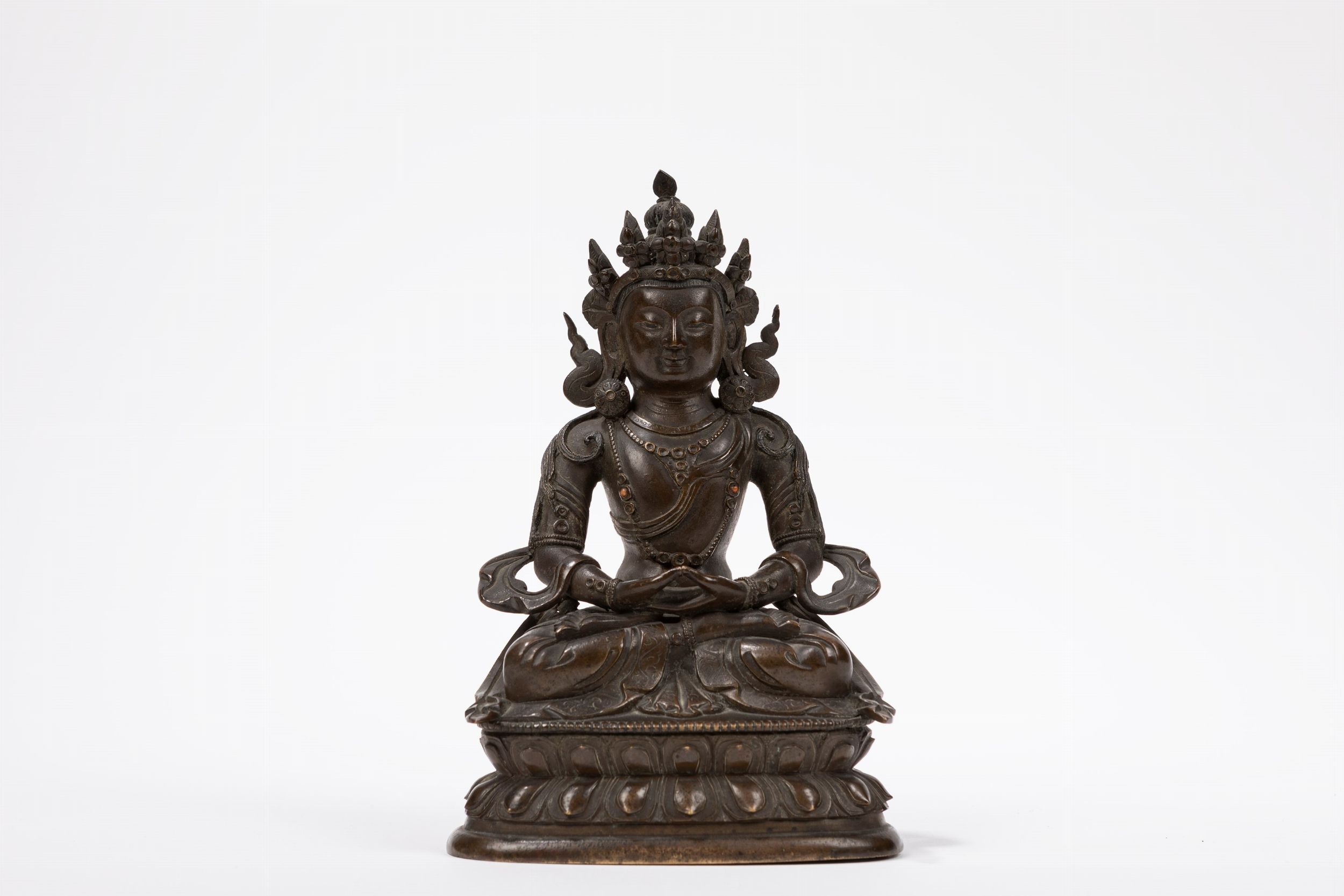 Tibet - Nepal, XIX secolo Raffigurante Tara Verde seduto su un doppio fiore di loto in posizione di dhyana mudra; il fondo è inciso con un'iscrizione dorata.