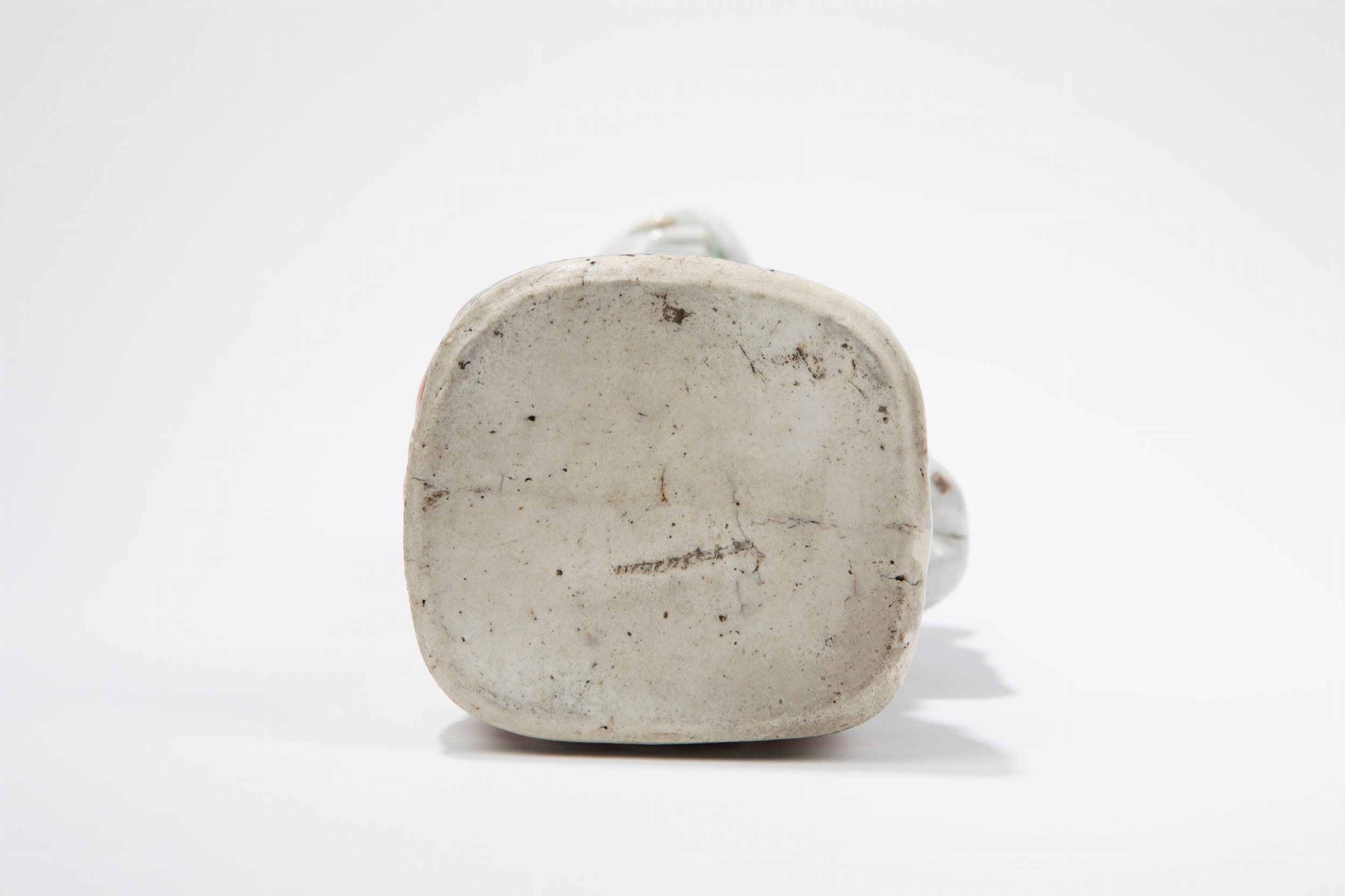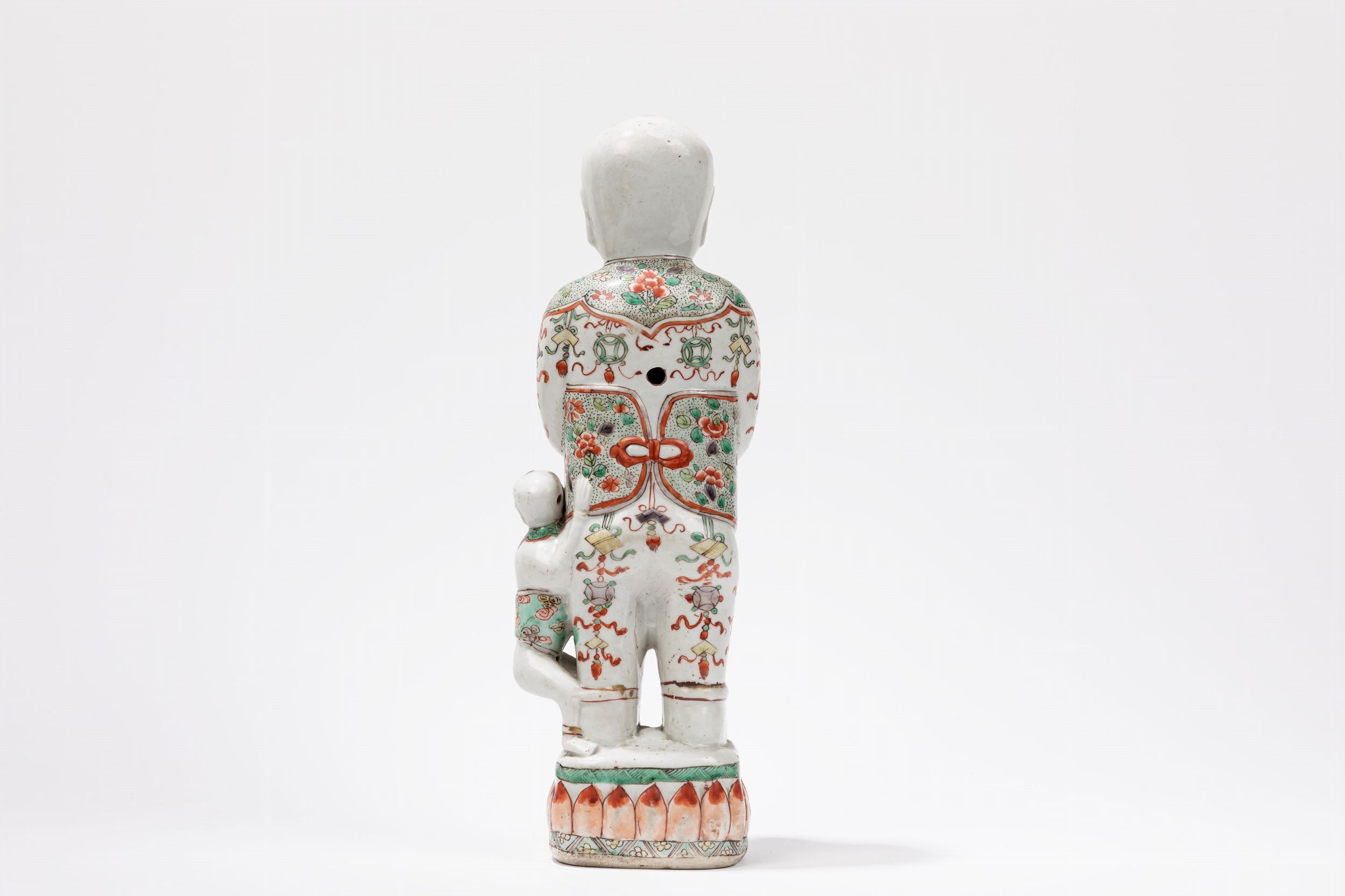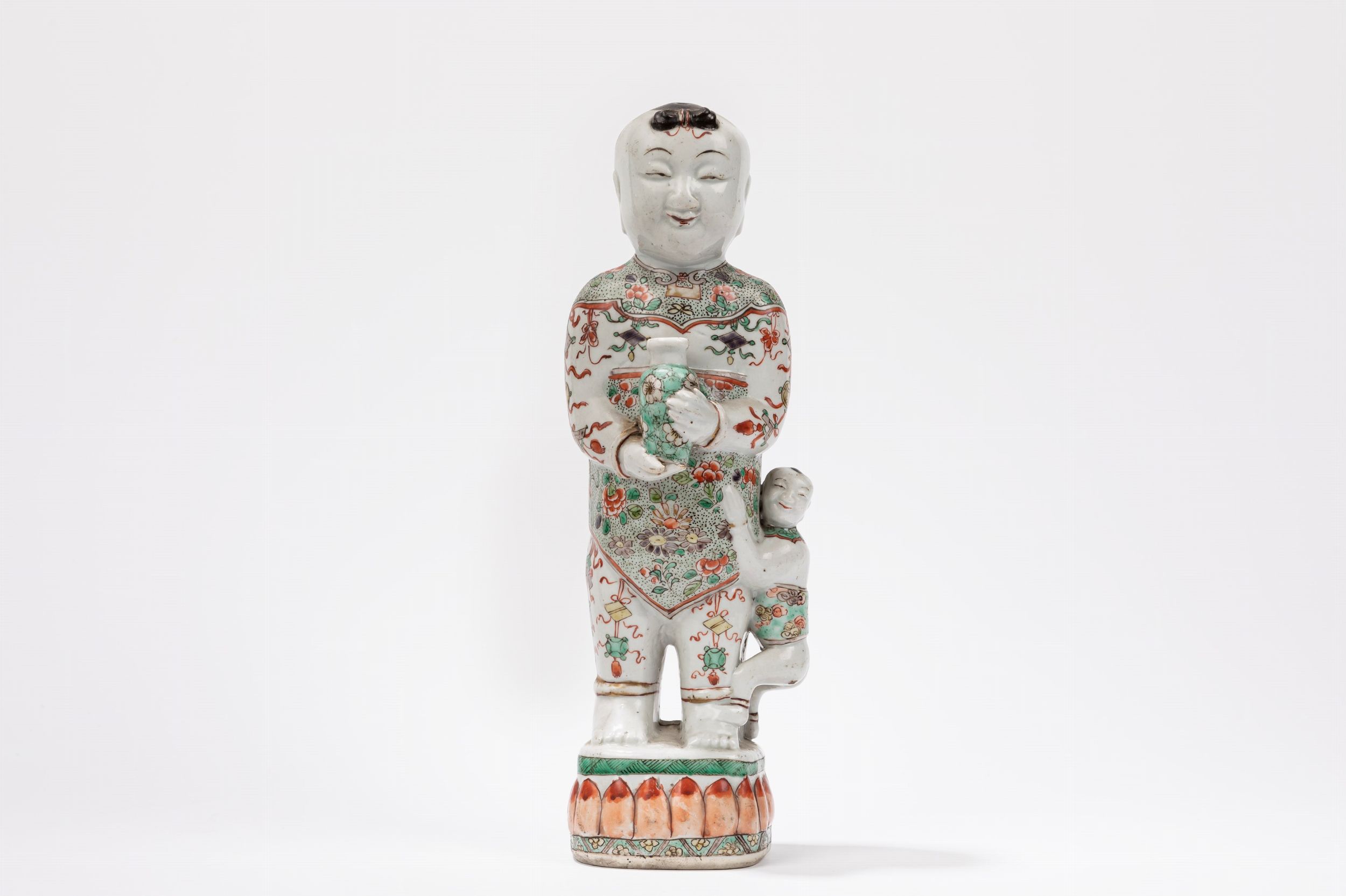 h cm 32,5 Cina, periodo Kangxi (1661-1722) Ben modellato a forma di ragazzo stante su una base di petali di loto con un vaso in mano ed un bambino che gli si aggrappa alla gamba destra; è ben decorato con fiori e simboli buddhisti.Provenienza: da una collezione privata toscana.