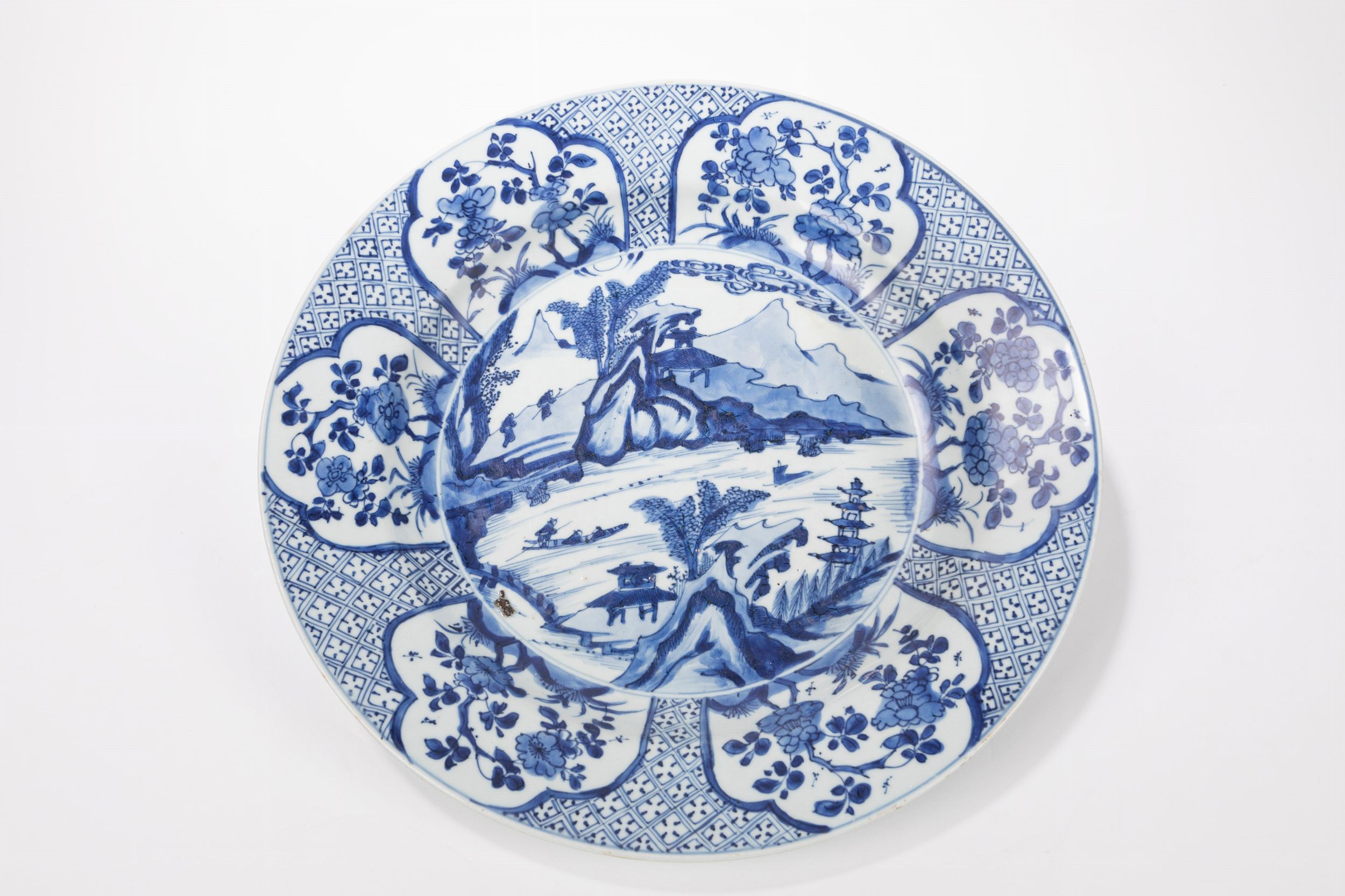 d cm 36 Cina, periodo Kangxi (1661-1722) Ben dipinto in al centro come un paesaggio con tre figure su di una barca in un fiume tra montagne e alberi; il bordo è dipinto con sei riserve con motivi floreale su uno sfondo ad alveare; sul bordo esterno sono presenti tre rami fioriti stilizzati e al centro è mercato con un oggetto antico all'interno di un doppio cerchio.