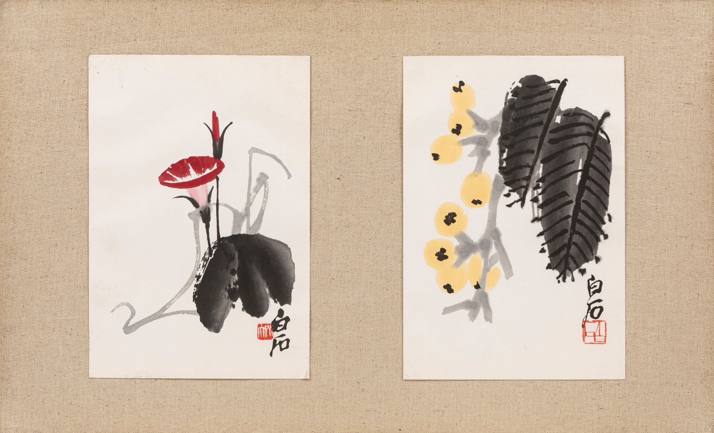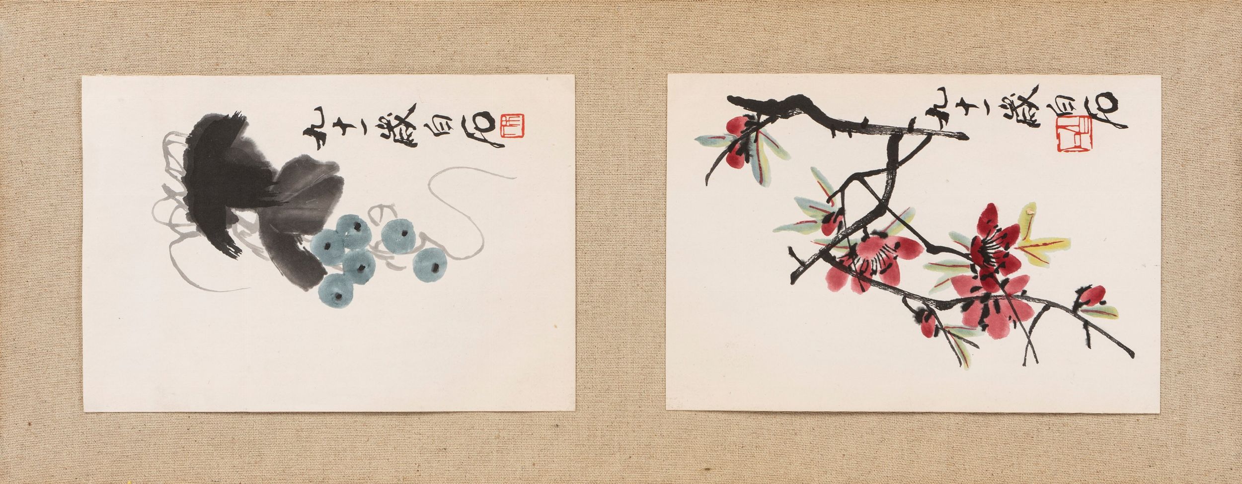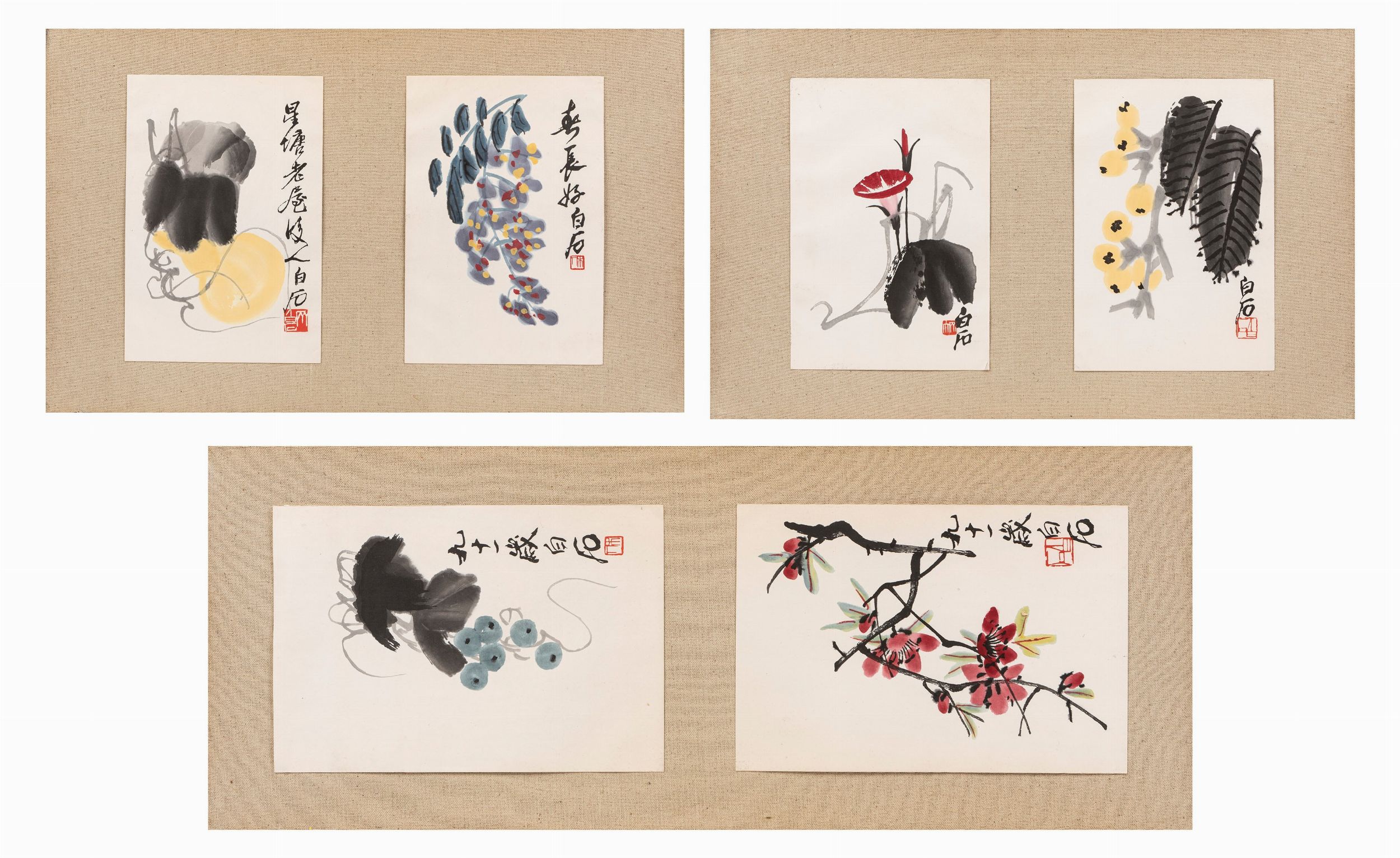 Cina, XX secolo Contenenti sei stampe su carta raffiguranti motivi naturalisti da famosi modelli di Qi Baishi.