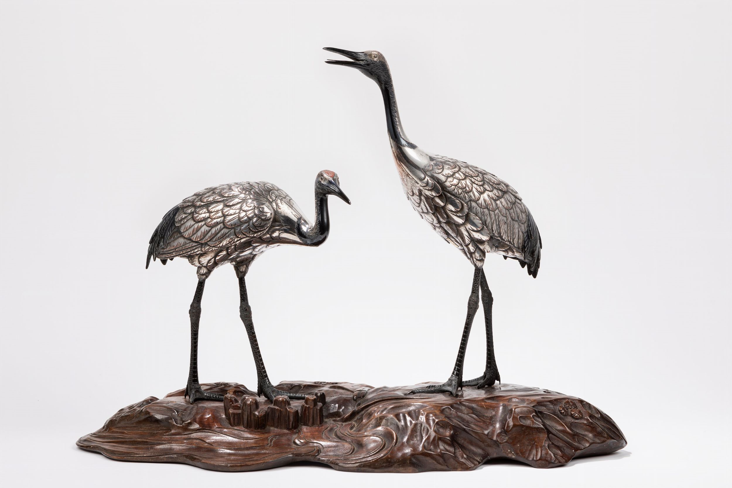 Giappone, Periodo Meiji (1868-1912) Raffigurante una coppia di Gru della Manciuria poggiante su una base in legno; firmato Hidenao entro riserva rettangolare dorata.