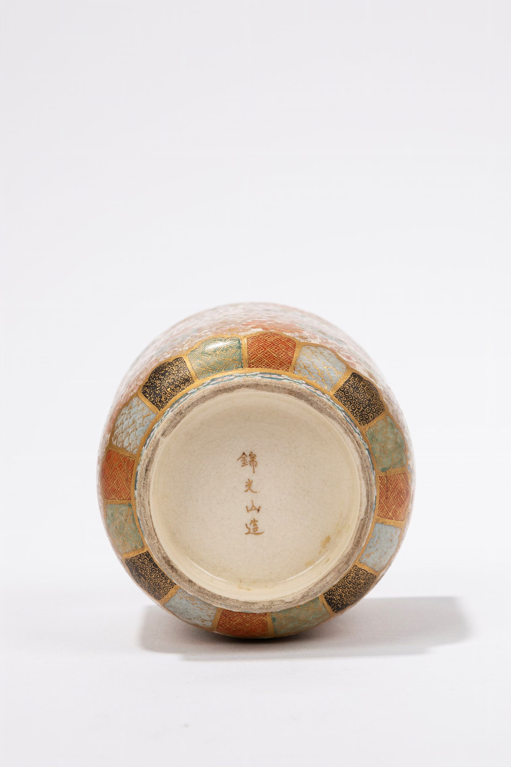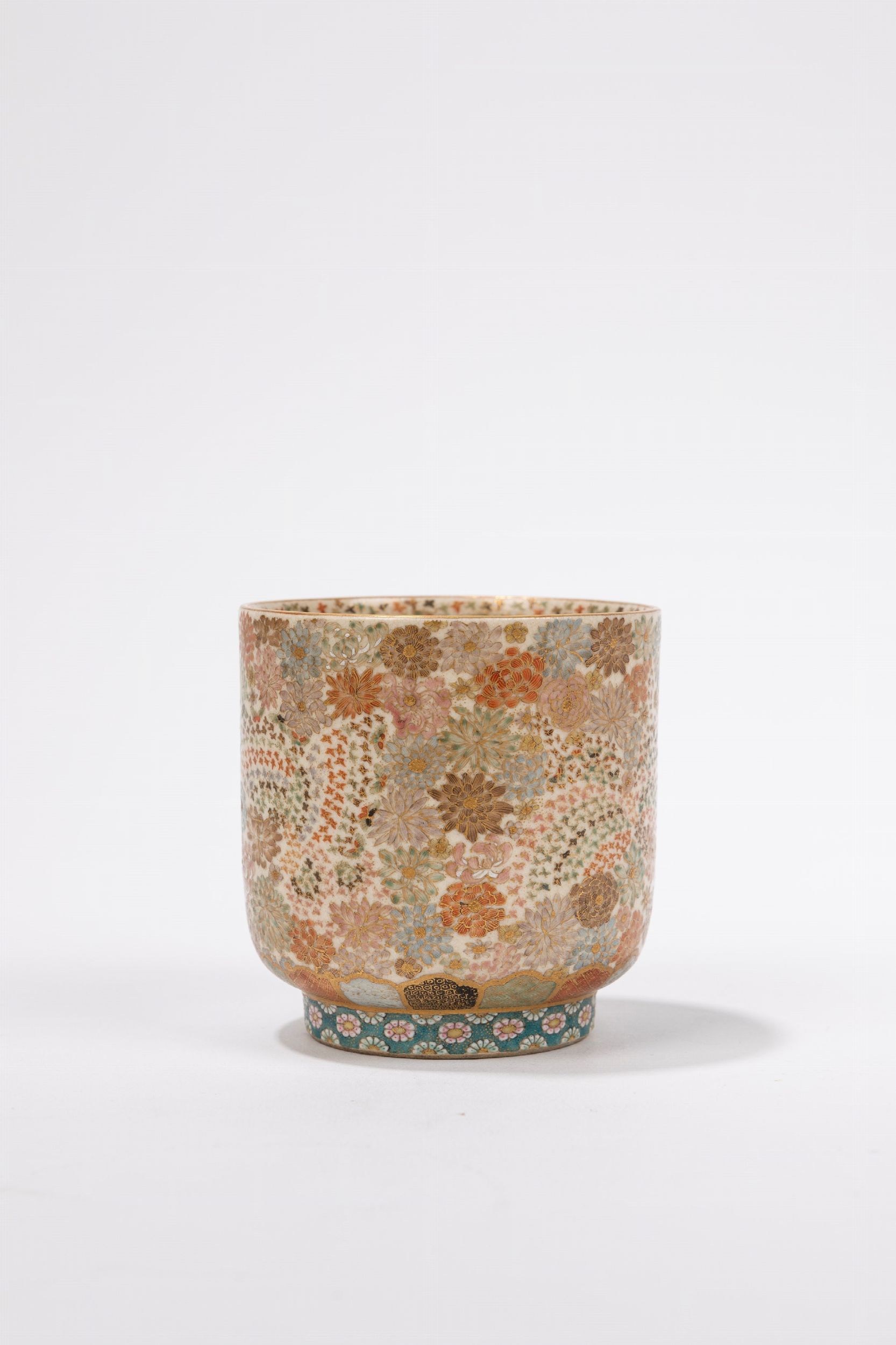 h cm 7 x d cm 6,8 Giappone, periodo Meiji (1868-1912) Arricchita con smalti policromi e dettagli in oro a tutto tondo, la scena, esternamente, vanta numerose farfalle in volo tra crisantemi di varie tonalità e specie; le piccole farfalle si combinano artisticamente per formare l'immagine di una farfalla più grande; la parte interna con decoro a mille farfalle; firmato in oro sotto la base Kinkōzan zō (Fatto da Kinkōzan).