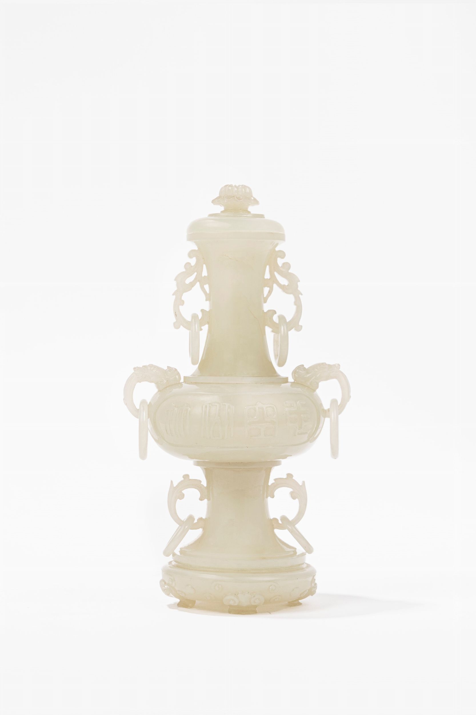 h tot cm 14,3 Cina, XX secolo Il vaso di forma elegante è intagliato con un totale di sei anse, che tengono un singolo anello; quattro delle anse sono a forma di foglie; sulle spalle del corpo globulare di forma globulare un paio di teste di bestie mitologiche formano le anse.Provenienza: da un'importante collezione italiana.