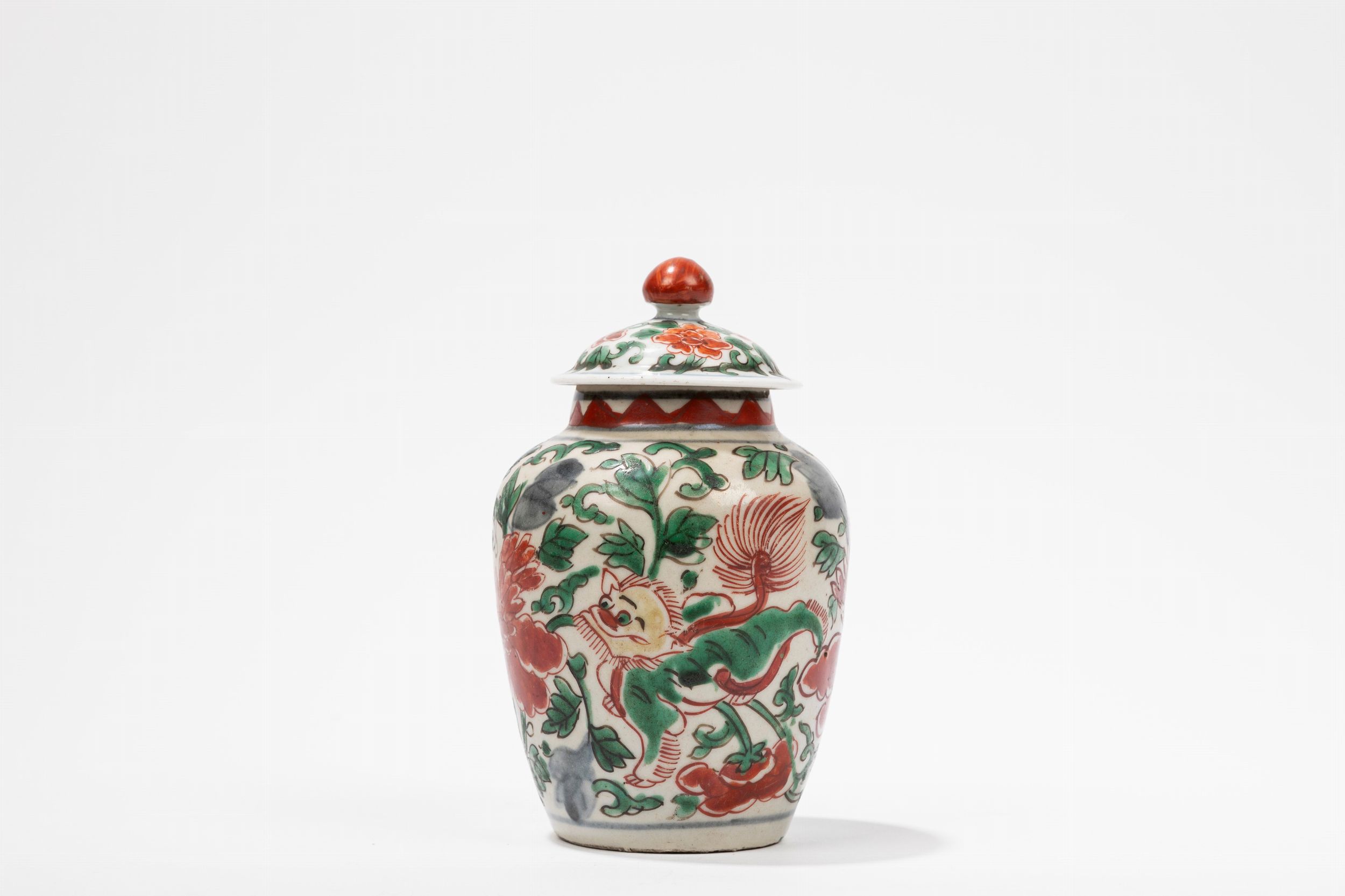 Cina, periodo di Transizione, XVII secolo Ben dipinto sul corpo e sul coperchio con smalti gialli, verdi e rossi sopra coperta e blu sotto coperta, raffigura due leoni tra peonie e foglie.Provenienza: da una collezione privata toscana.