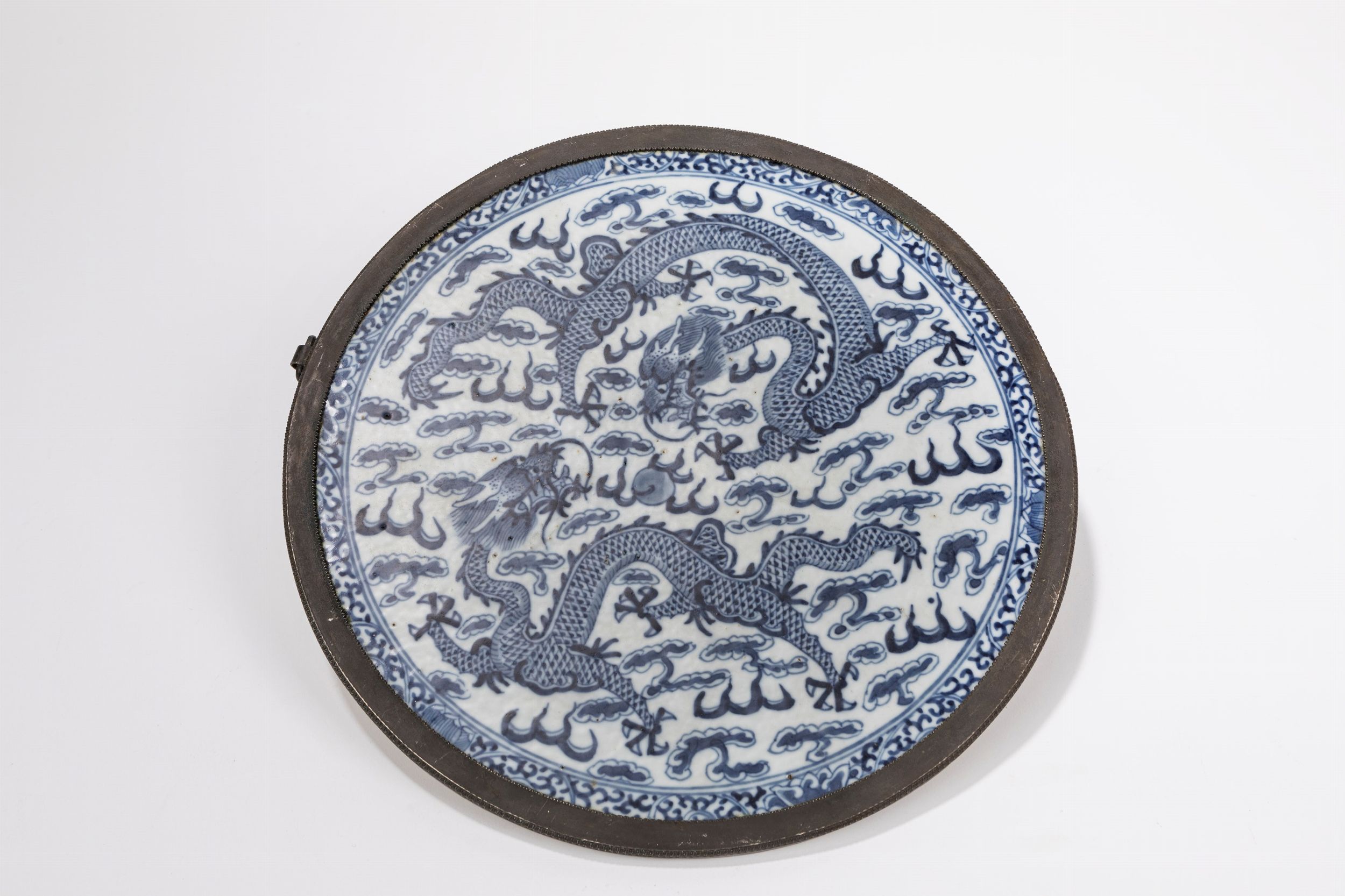 Cina, dinastia Qing, fine XIX secolo Decorata in blu sotto coperta con due dragoni che volano tra le nuvole.