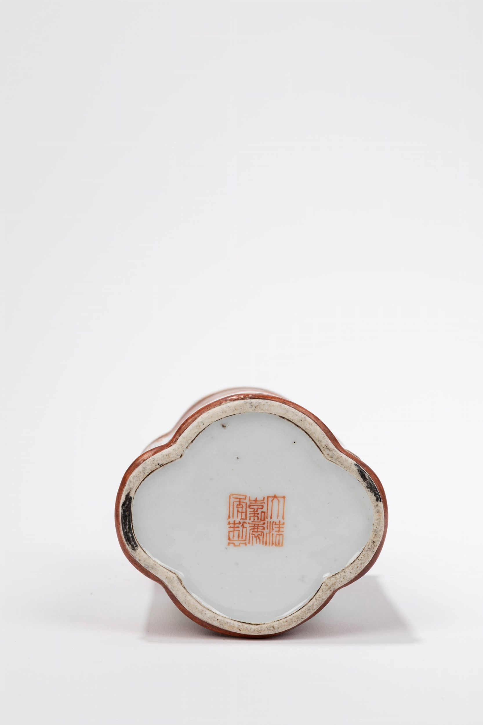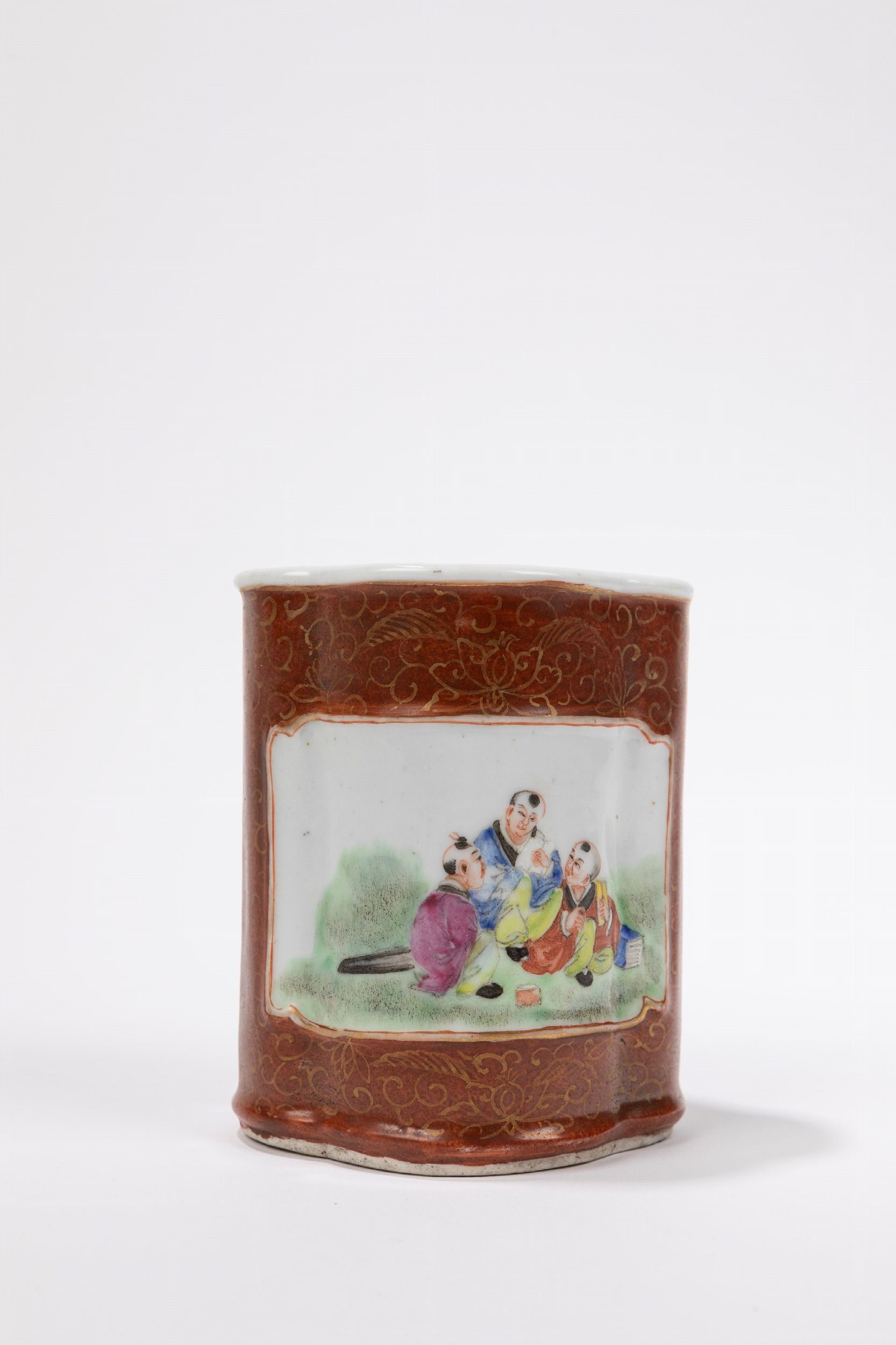 Cina, Repubblica di Cina (1912-1949) Dalla forma polilobata a fondo ruggine con riserve contententi bambini che giocano; reca il marchio apocrifo dell'Imperatore Jiaqing.