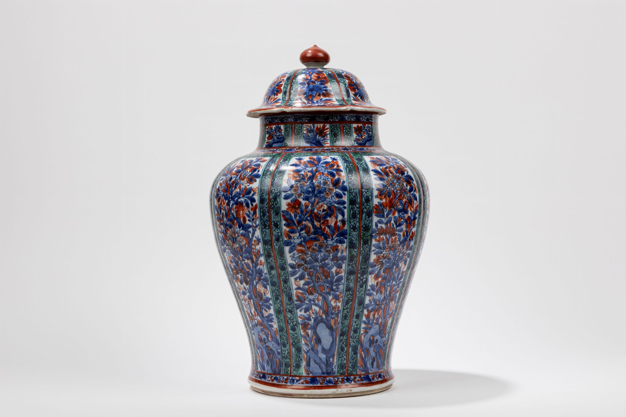Cina, periodo Kangxi (1661-1722) Ben dipinta su tutto il corpo e il coperchio con otto riserve con all'interno fiori che sorgono da rocce; il centro della base è marcato in blu sotto coperta con una foglia all'interno di un doppio cerchio.