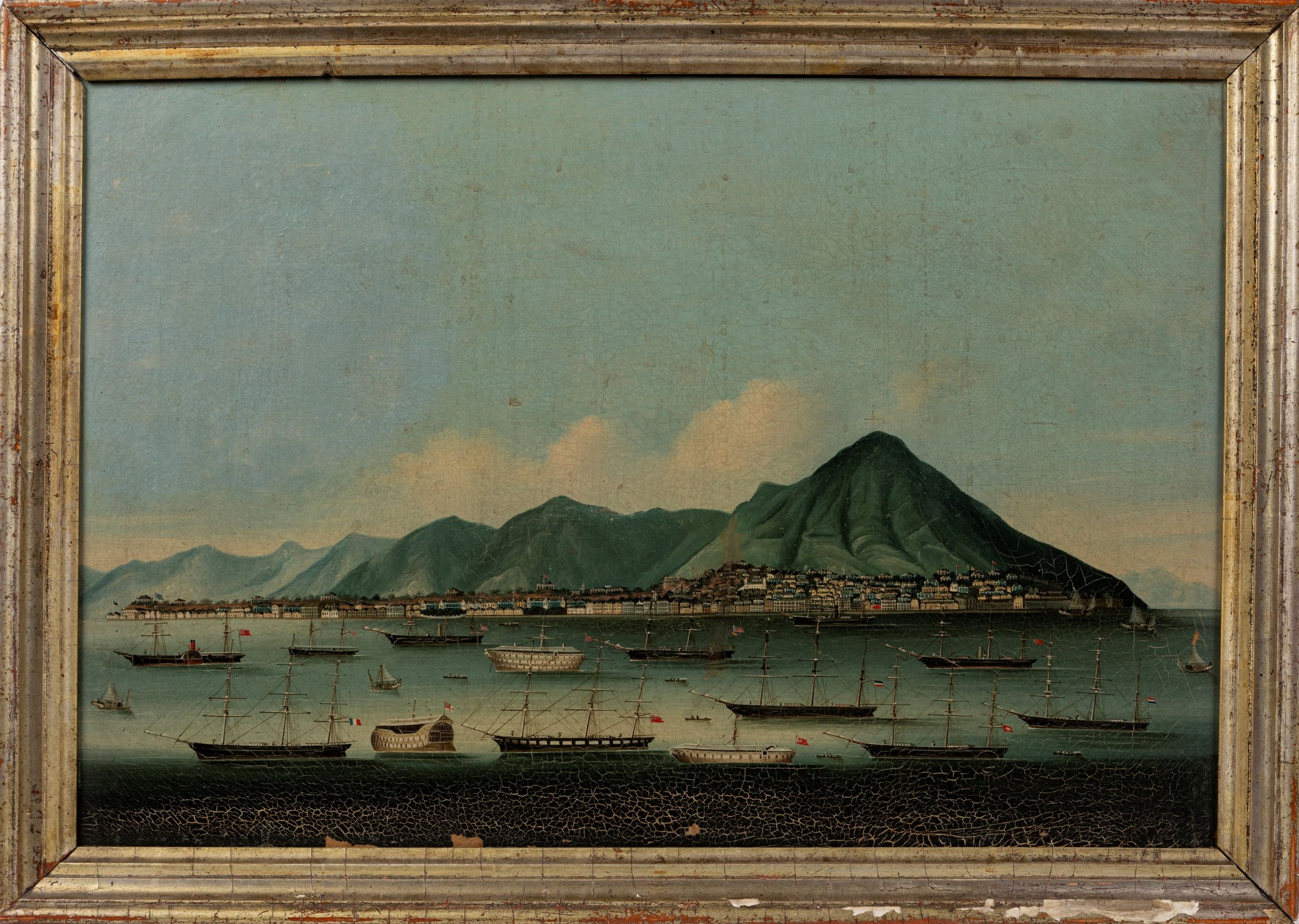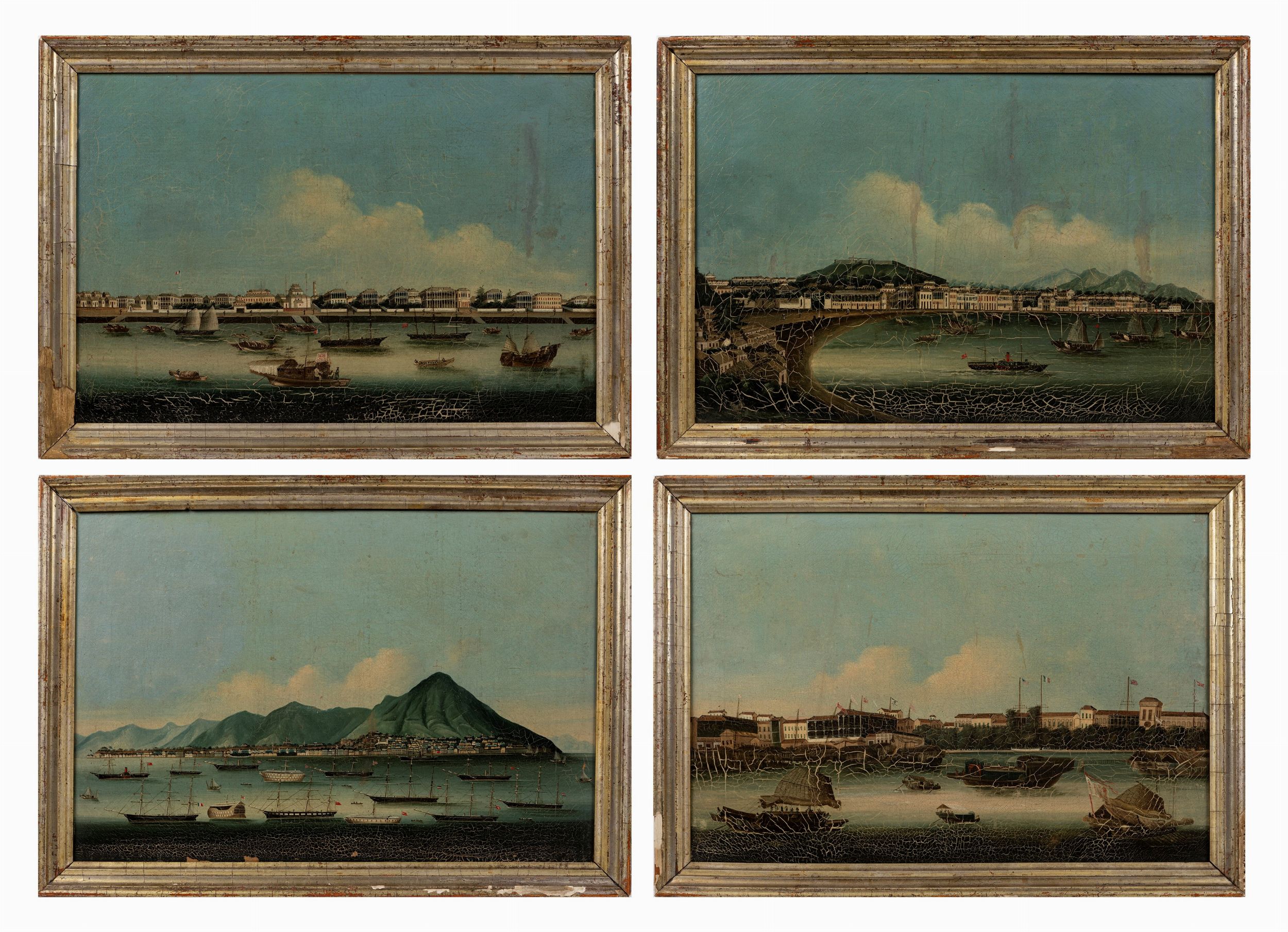 Cina, dinastia Qing, metà XIX secolo Ciascuno raffigurante una veduta di Canton con imbarcazioni e palazzi su cui sventolano bandiere di diverse nazionalità (francesi, americane, inglesi, danesi, ecc.).