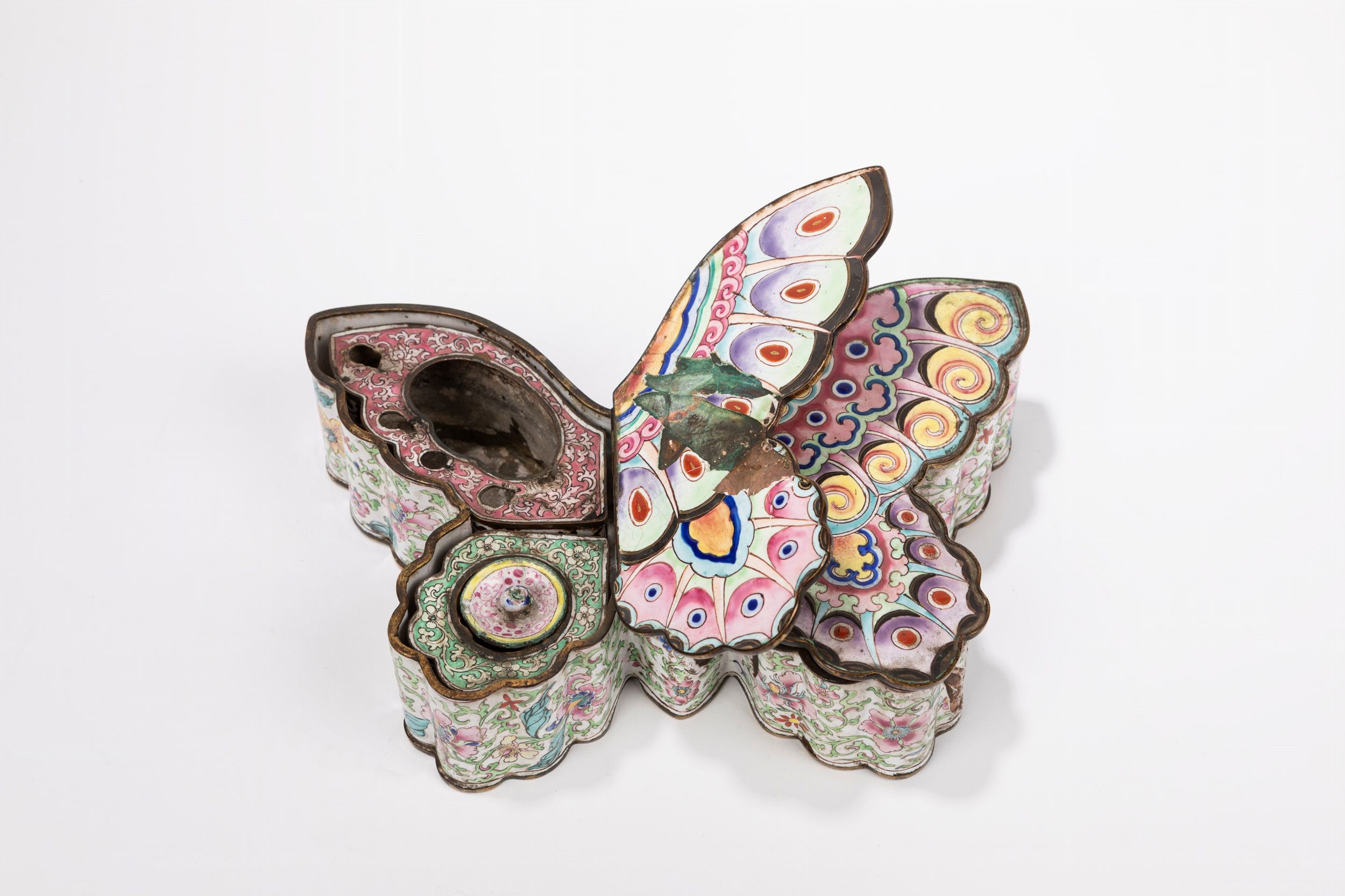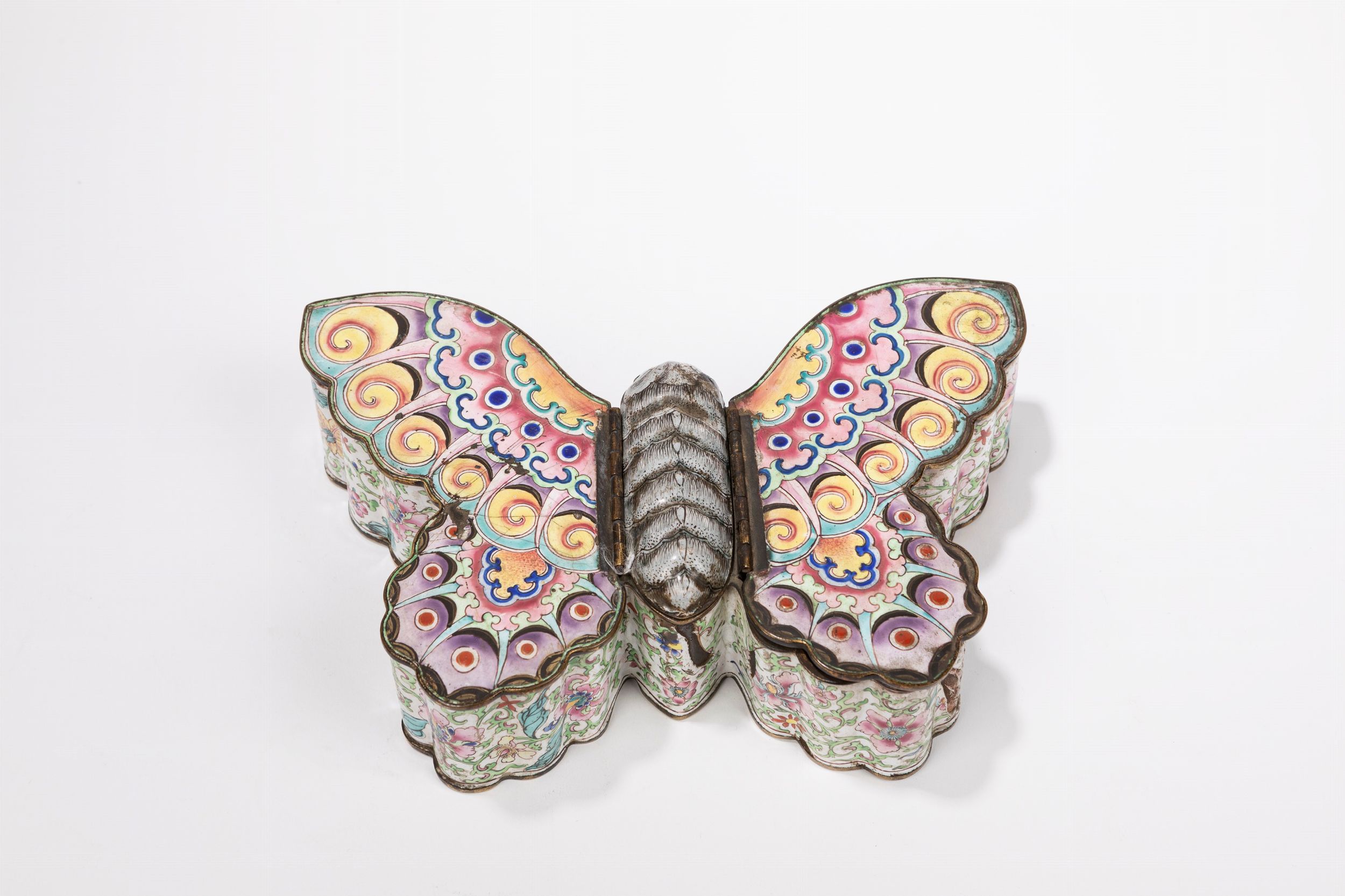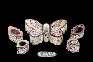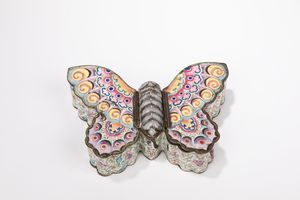 h cm 5,5 x l cm 22 Cina, dinastia Qing, XVIII secolo A forma di farfalla, è ben dipinta nei colori della famiglia rosa in maniera naturalistica verosimile con fantasie tipiche delle ali di farfalla, sullo spessore è dipinta con fiori e foglie; all' interno è composta da diversi scomparti tutti decorati con lotus scroll.
